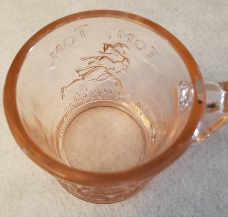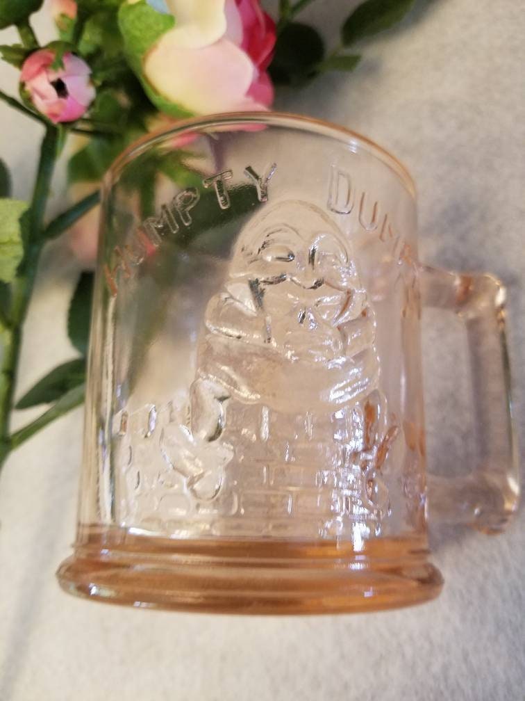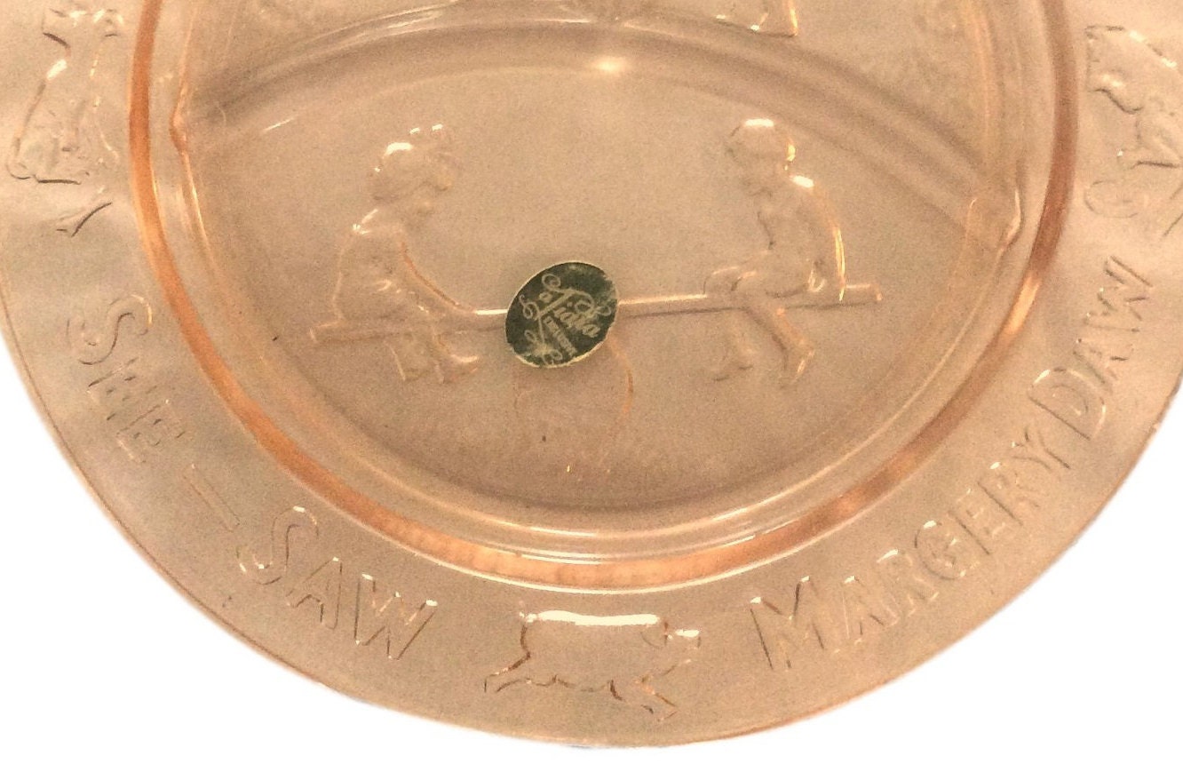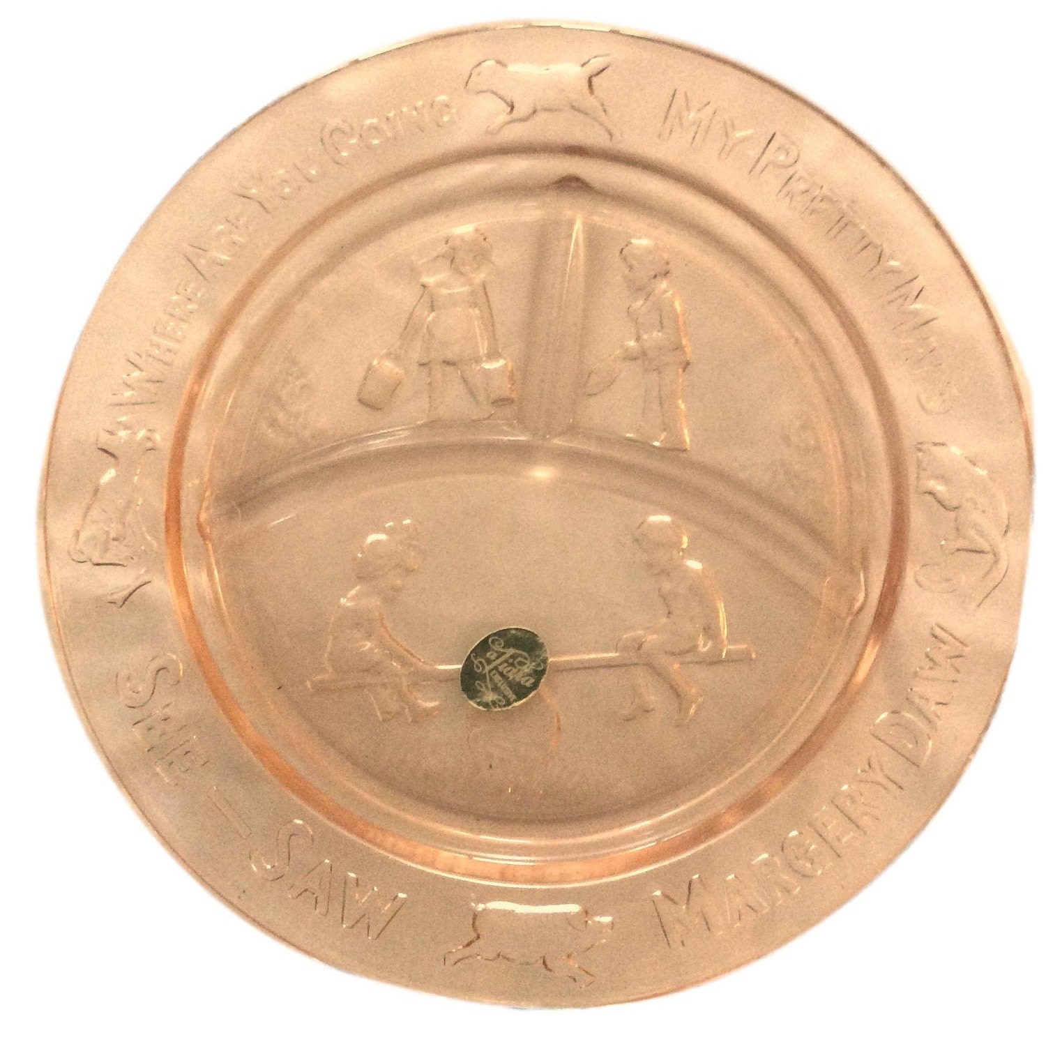 This is a vintage Tiara Glass, Indiana glass pink blush glass divided dish and mug from the 1970's. It has the original label. The pink glass plate has embossed "SEE SAW, MARGERY DAW, WHERE ARE YOU GOING, MY PRETTY MAID.