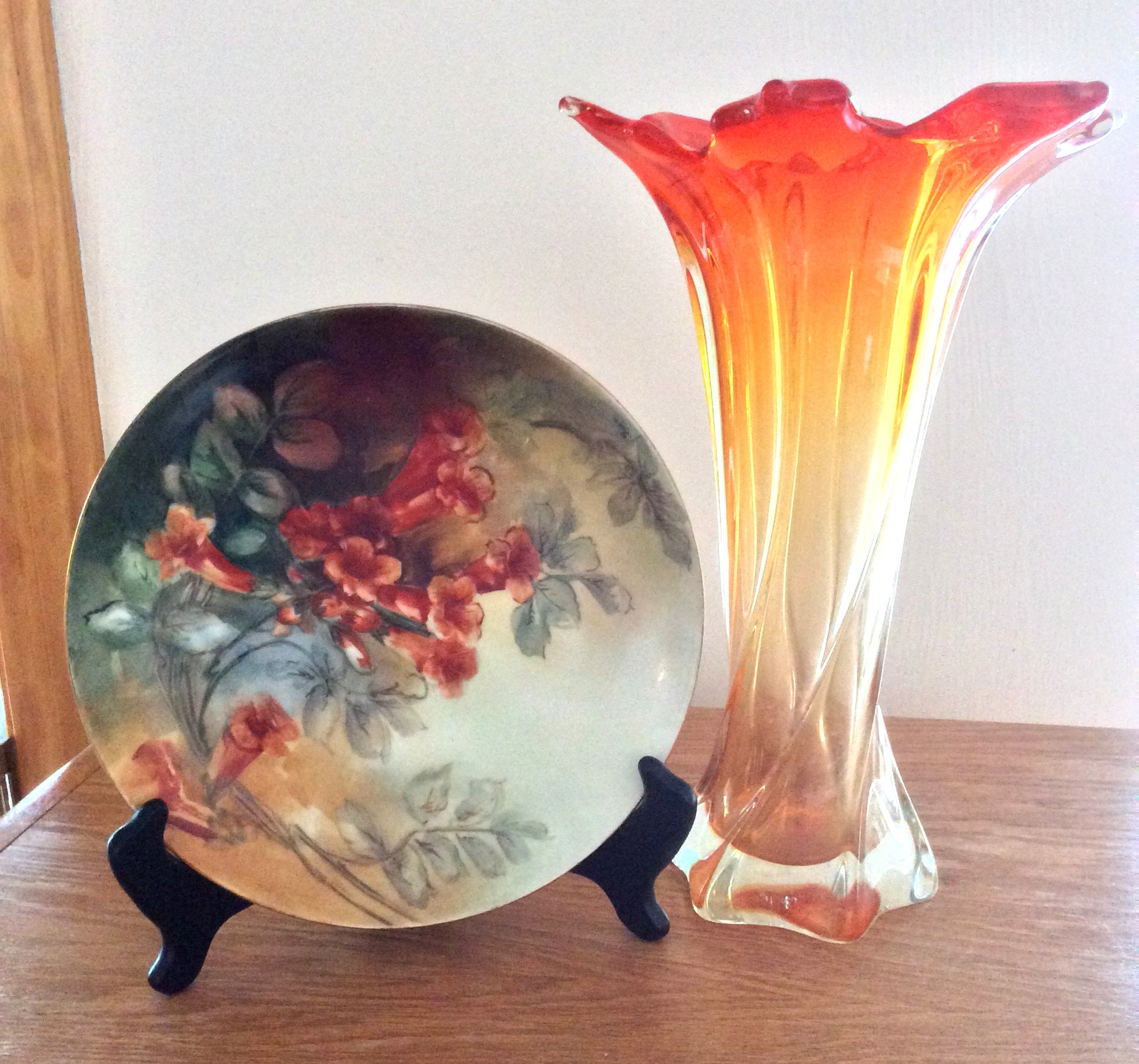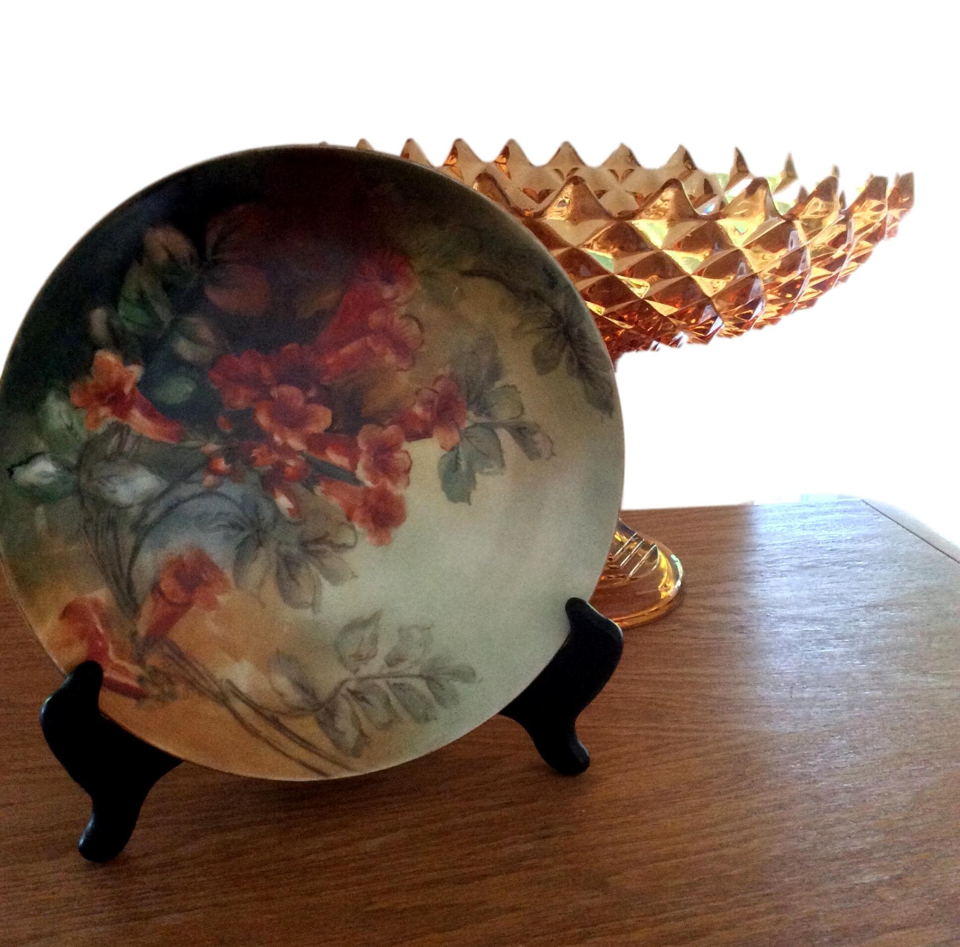 This is a porcelain Haviland plate from France. This French china, hand painted, decorative floral wall hanging plate features beautiful orange trumpet flowers (Gloxinias) with green leaves and stems. Wall hanging plates are great pieces to adorn your wall.