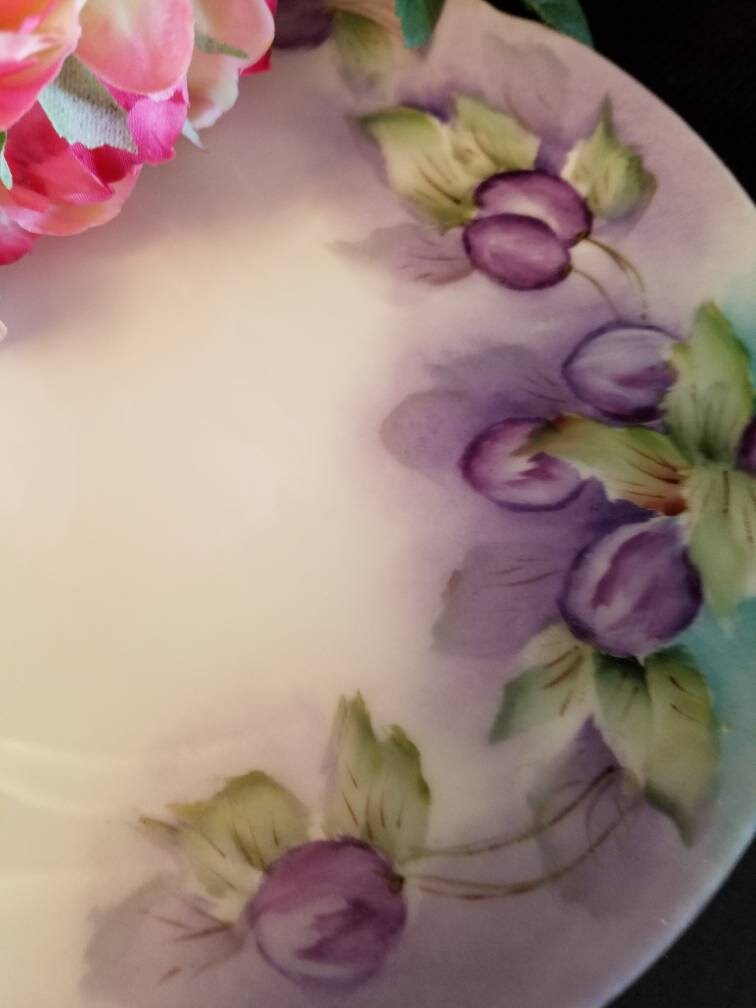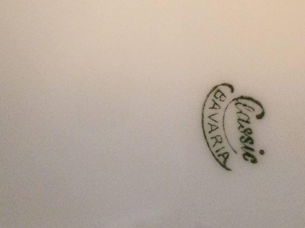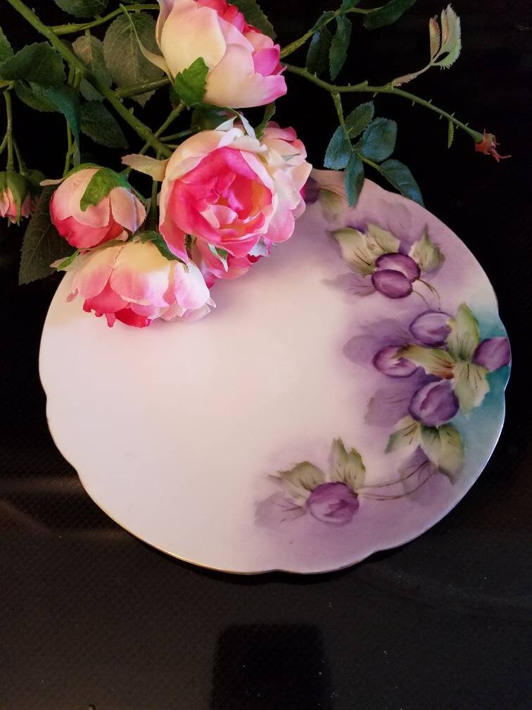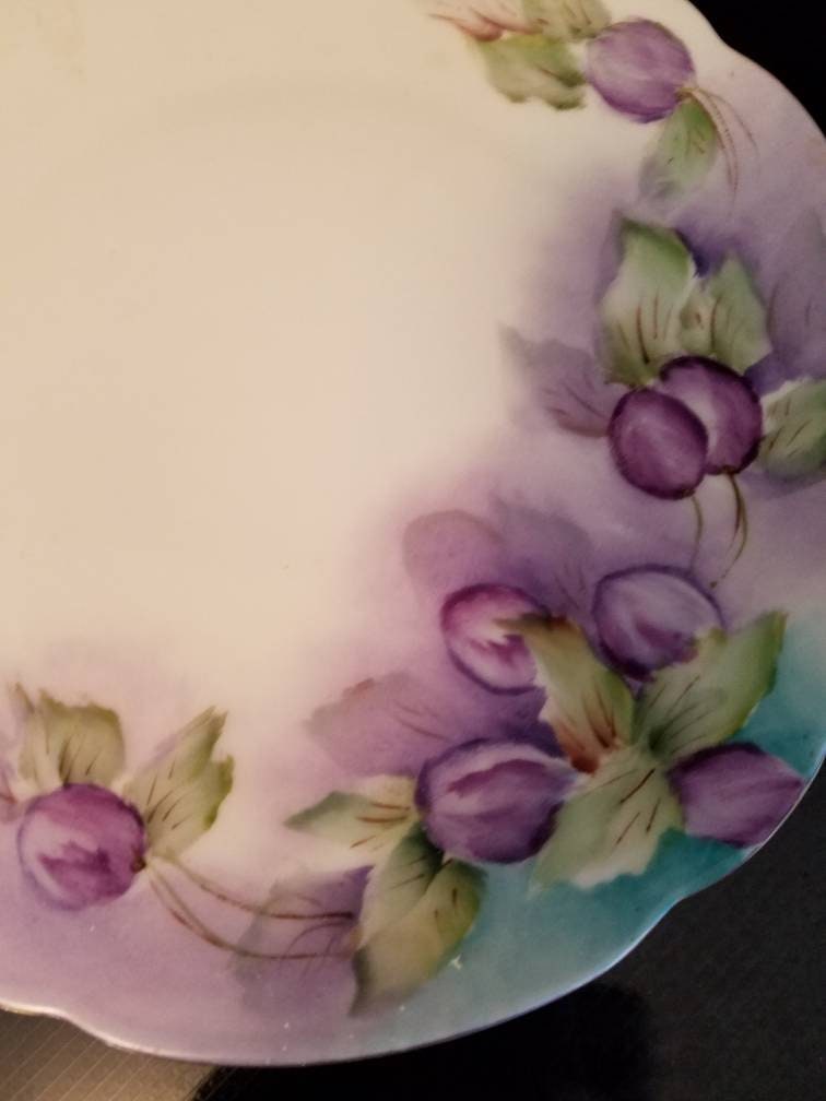 This is a hand painted plum Bavarian plate. The small plate measures 7 3/4 inches in diameter. It has scalloped edges and fine gold trim. It is marked Classic Bavaria on the back of the wall hanging plate. It has beautiful purple plums and green leaves on a white background. It is in good condition with no cracks, chips, or crazing.