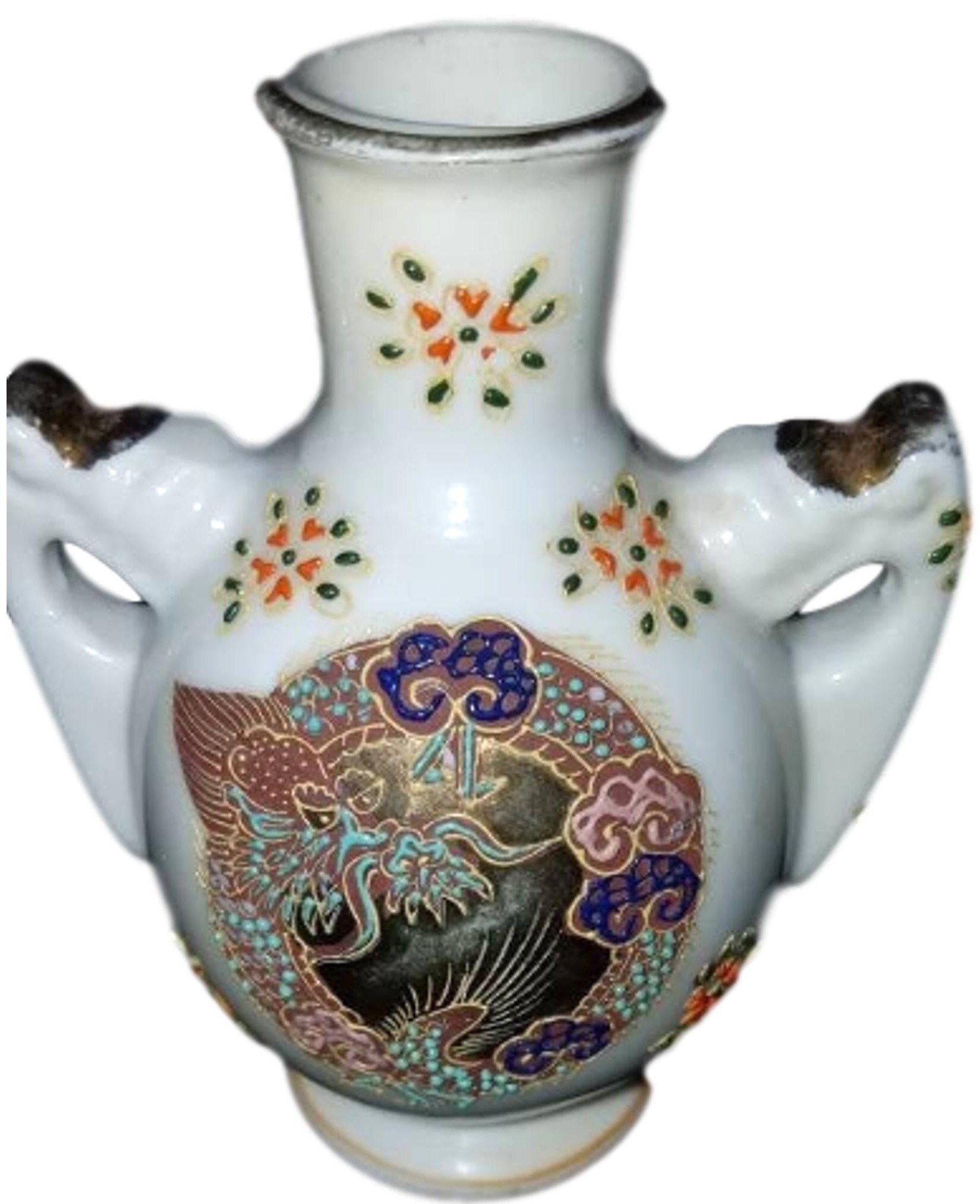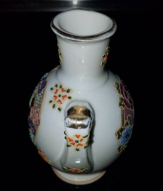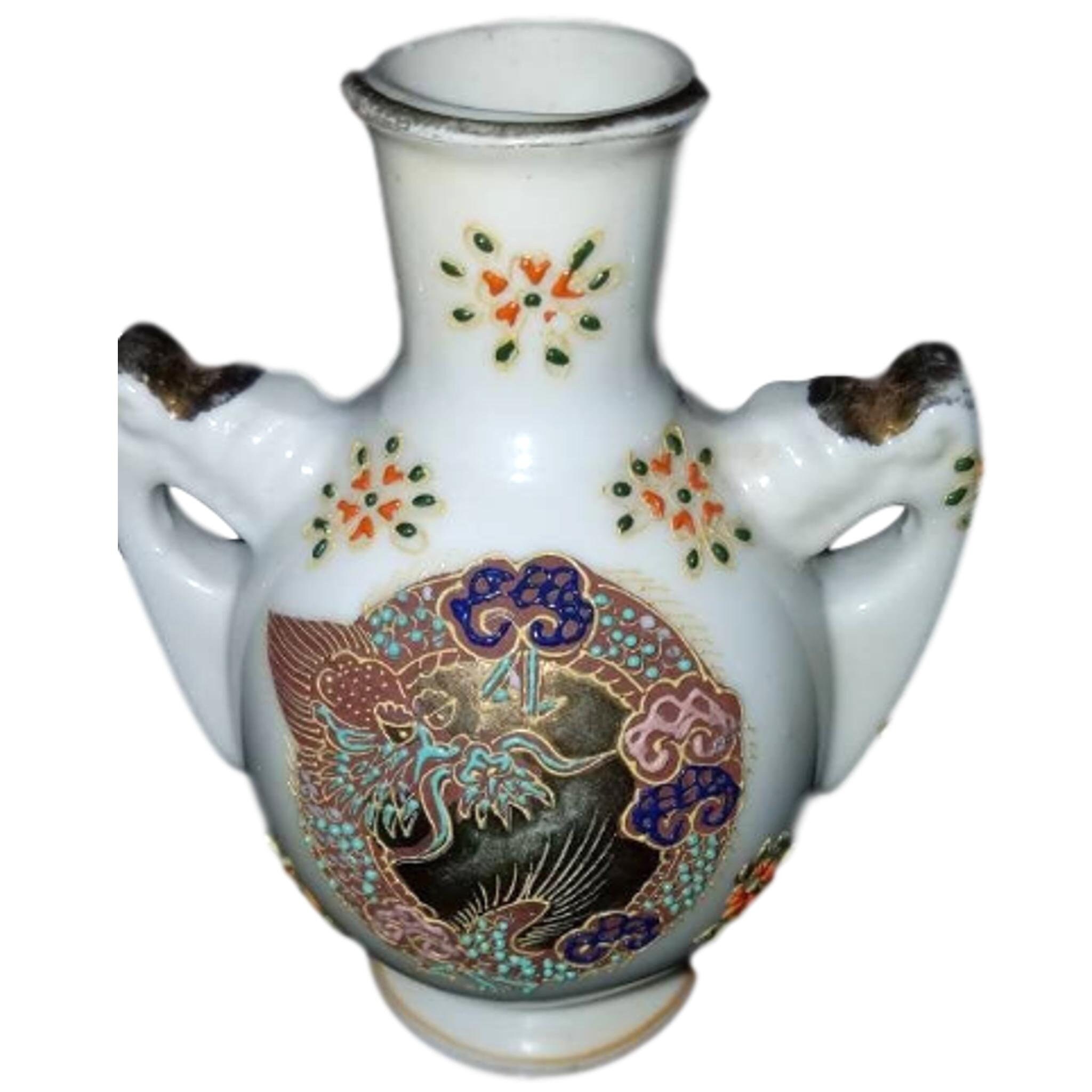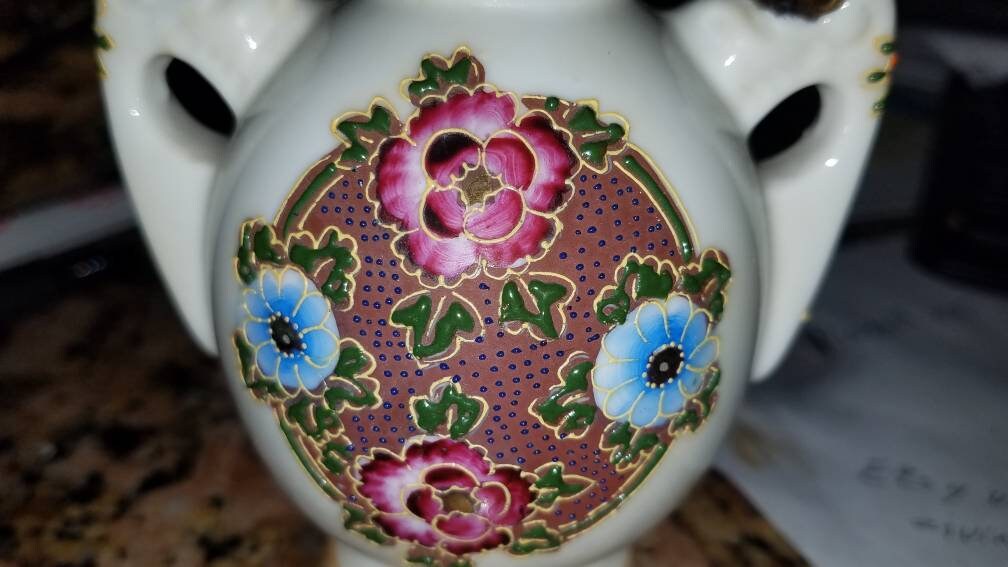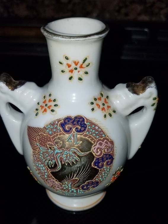Add this exclusive miniature vase to your collection today, with limited pieces available. We stand behind our work with attentive customer service, secure packaging, and care guidance to ensure your vase remains a cherished treasure for years to come.Satsuma design handmade Moriage porcelain minimalist vase. Measures 4.75" in height. It has two handled with gold trim. There is some gold paint loss. Made in Japan. No chips or cracks.