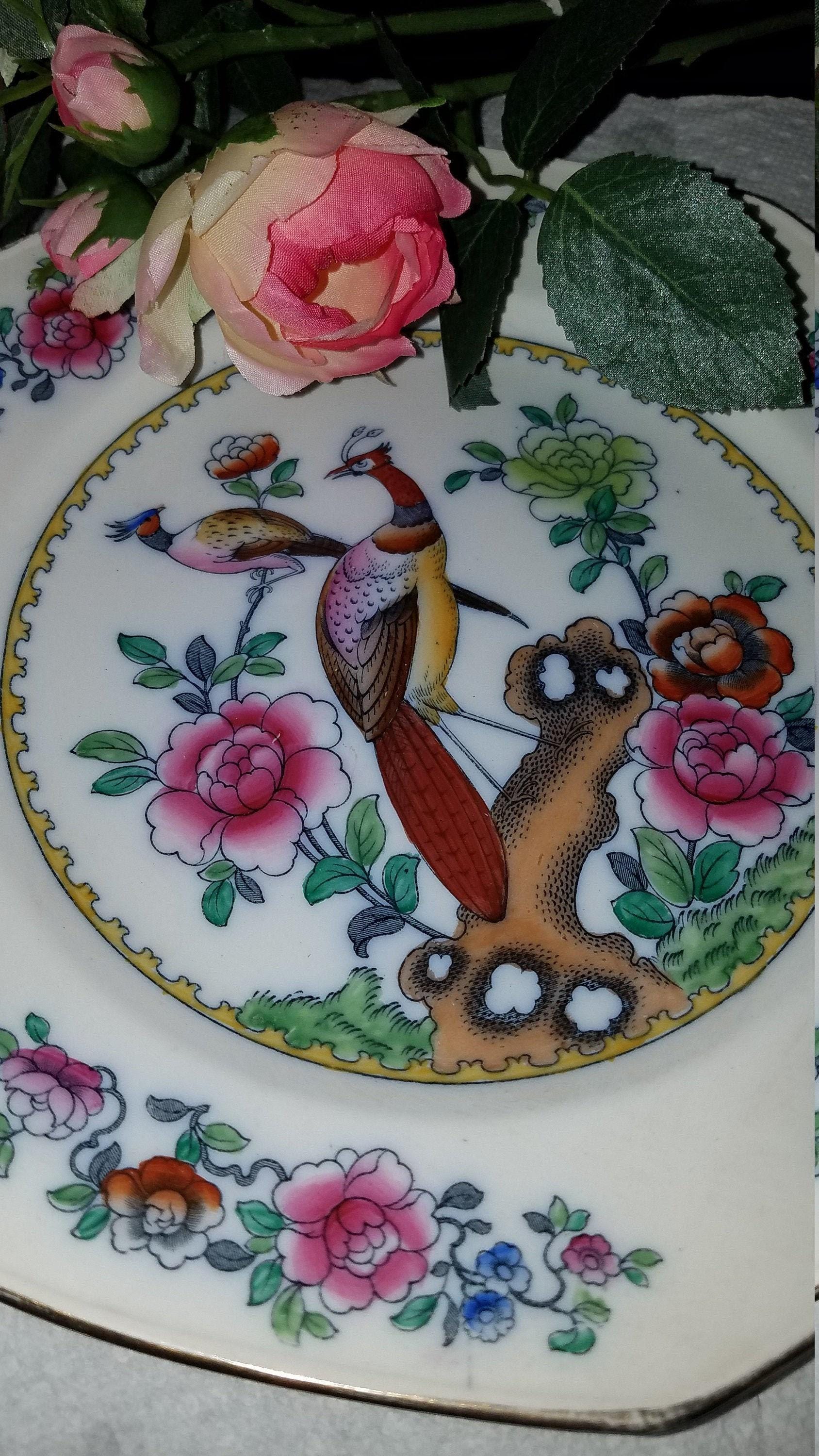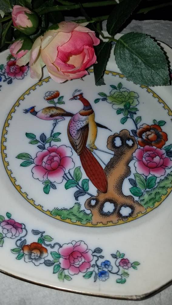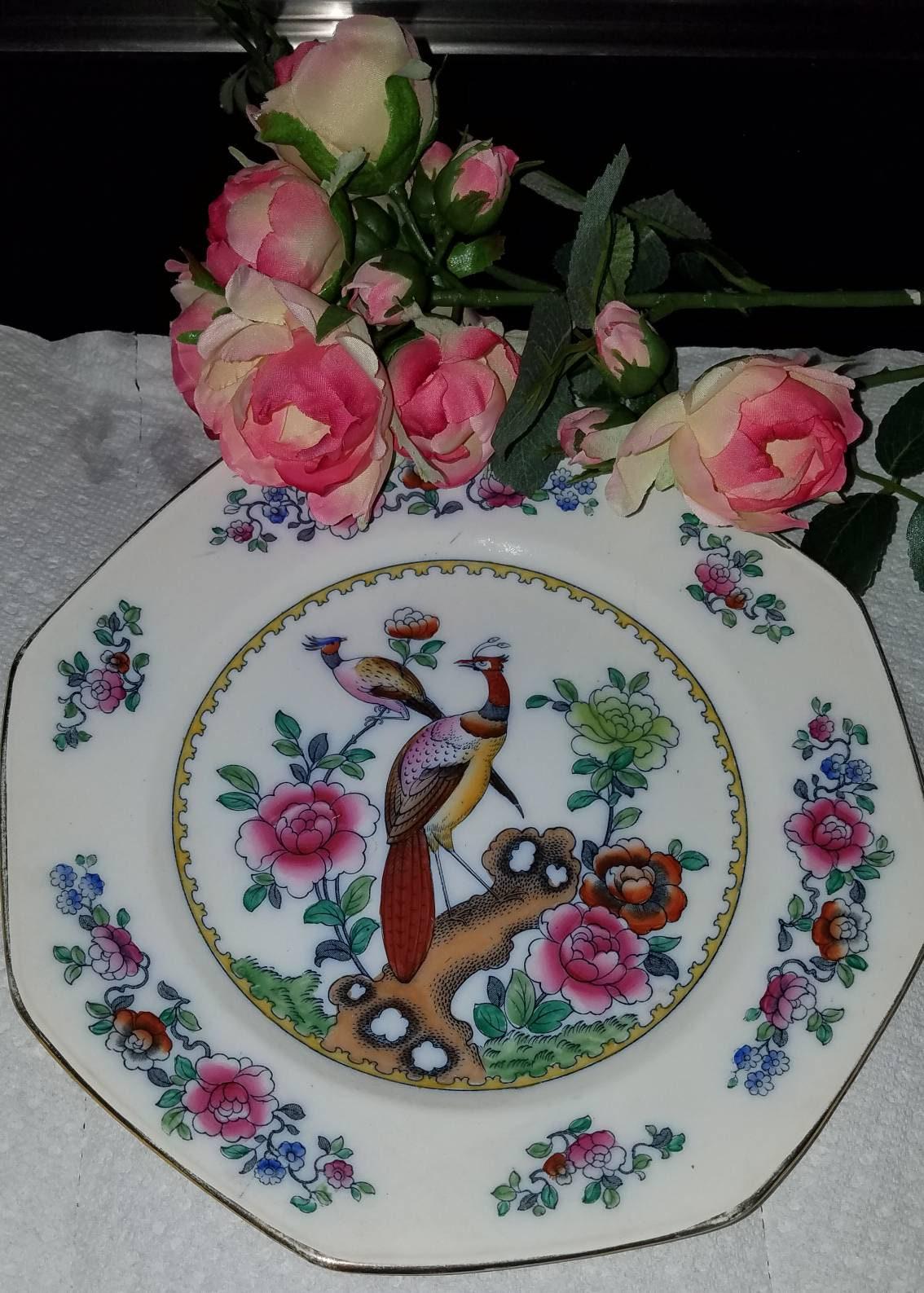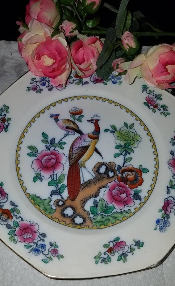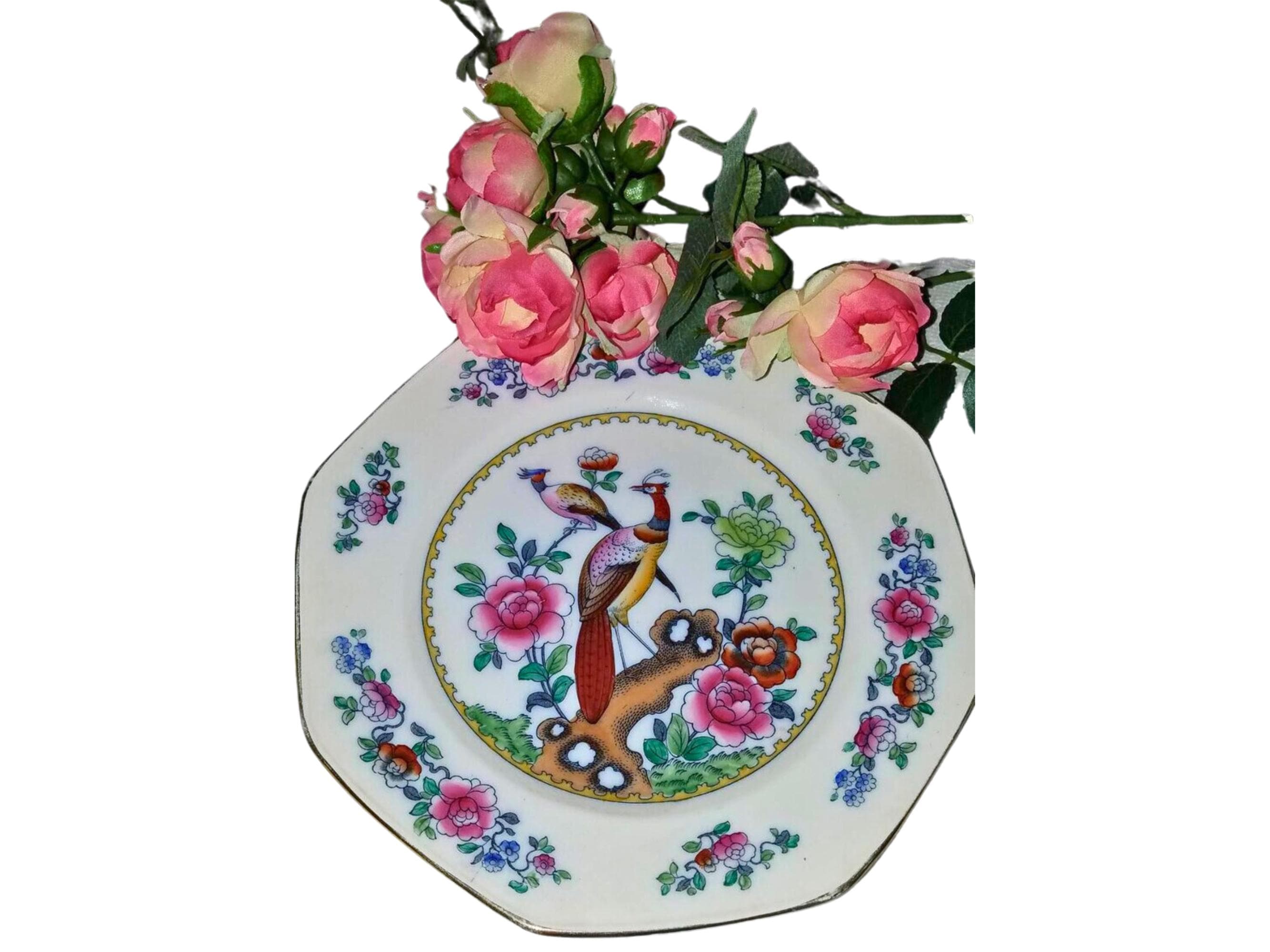 F Winkle Whieldon Ware Old Chelsea 8 5/8-inch vintage cake plate. Hand painted octagon-shaped floral rim vintage plate with a pair of pheasant game birds. Some small gold paint loss on the rim. Not recommended for dishwasher.