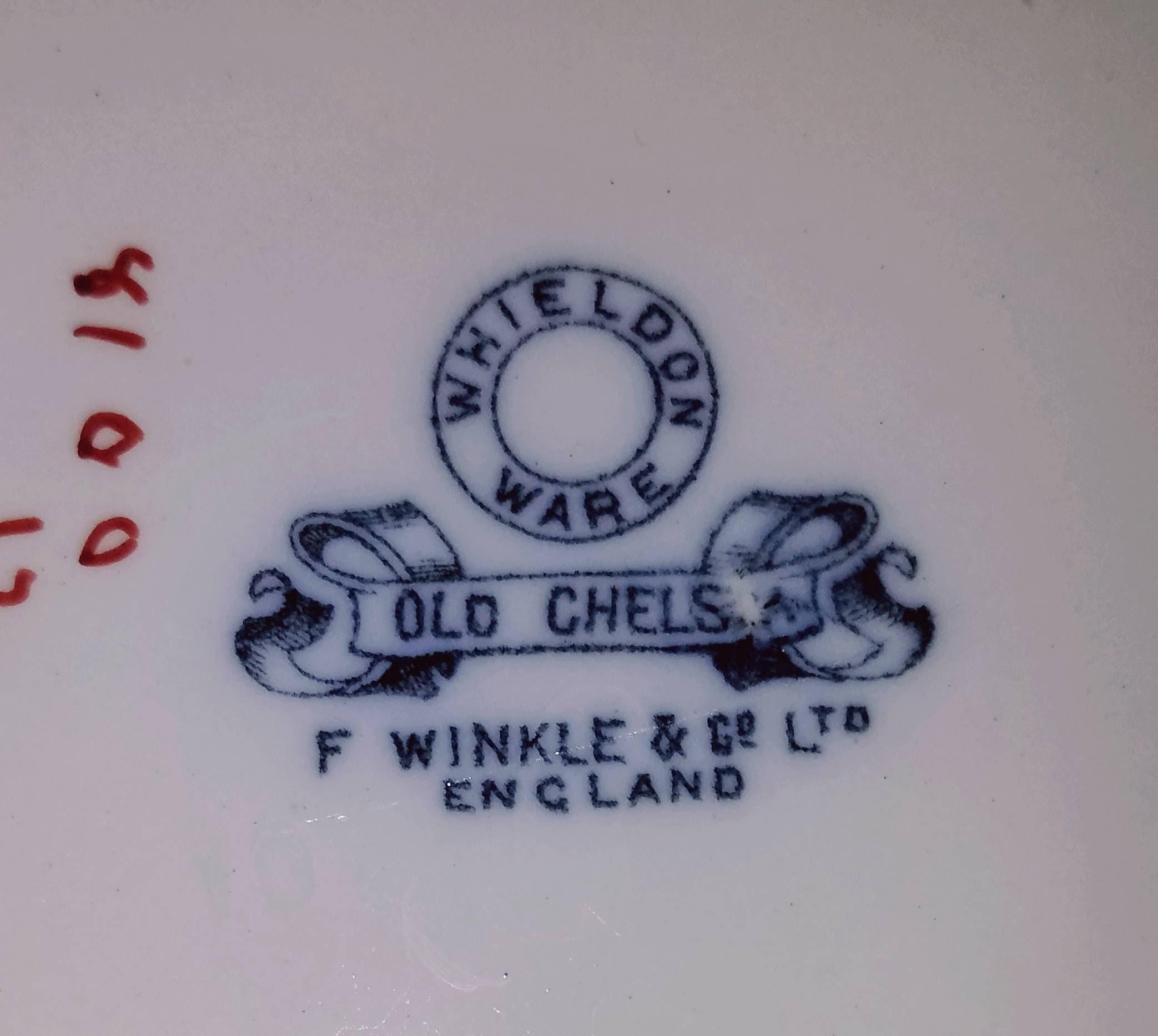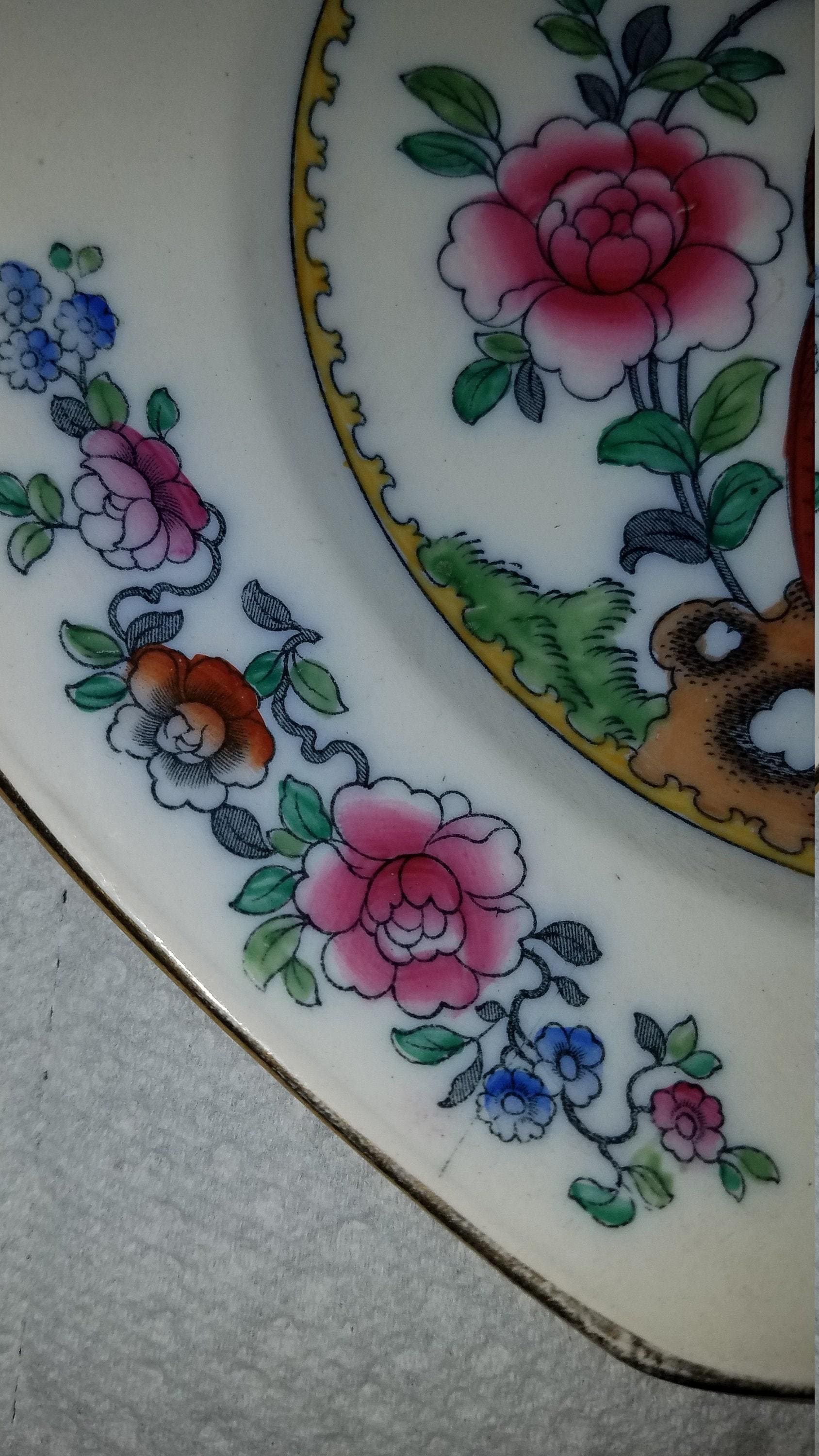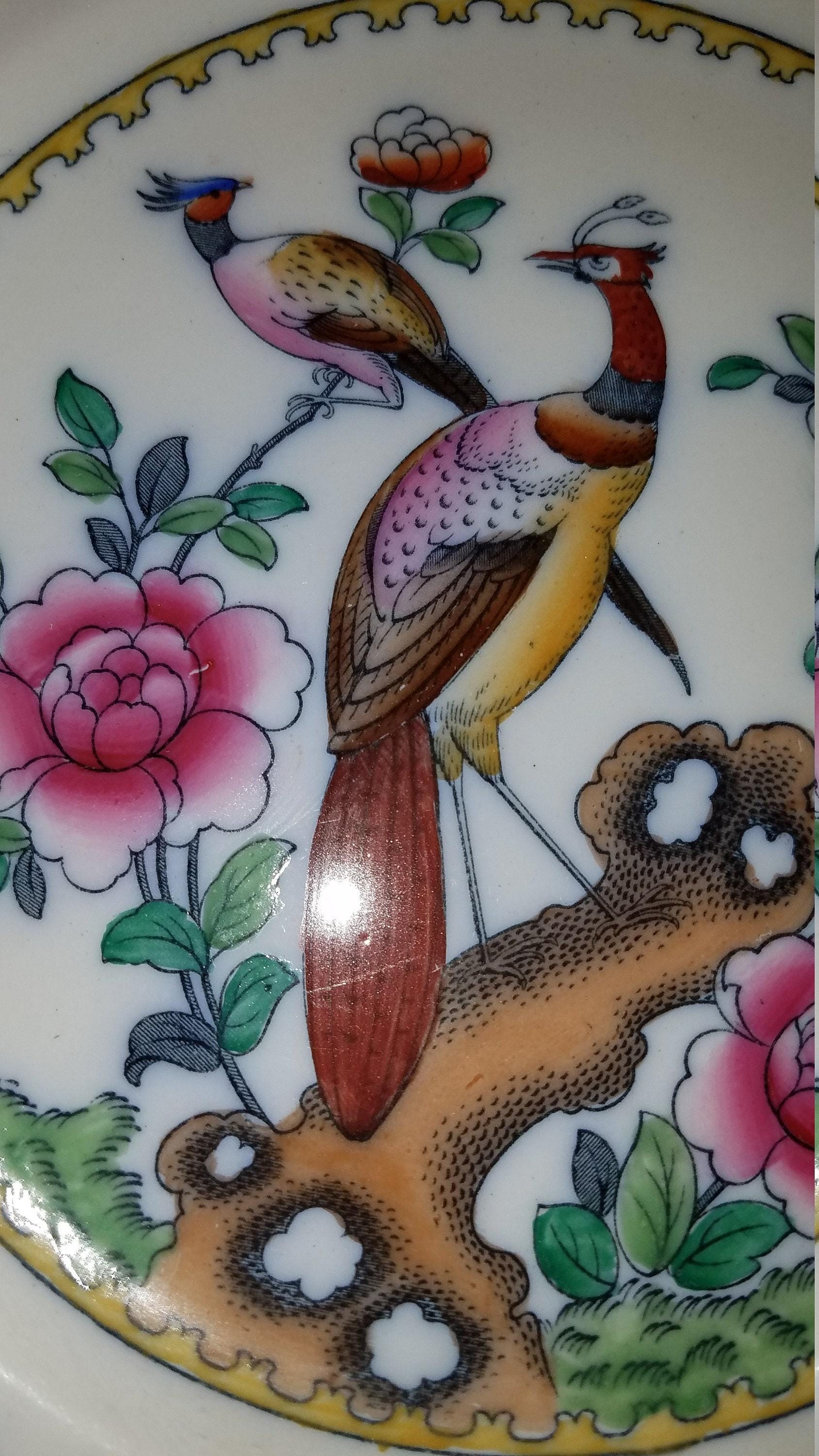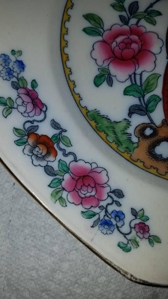 F Winkle Whieldon Ware Old Chelsea 8 5/8-inch vintage cake plate. Hand painted octagon-shaped floral rim vintage plate with a pair of pheasant game birds. Some small gold paint loss on the rim. Not recommended for dishwasher.
