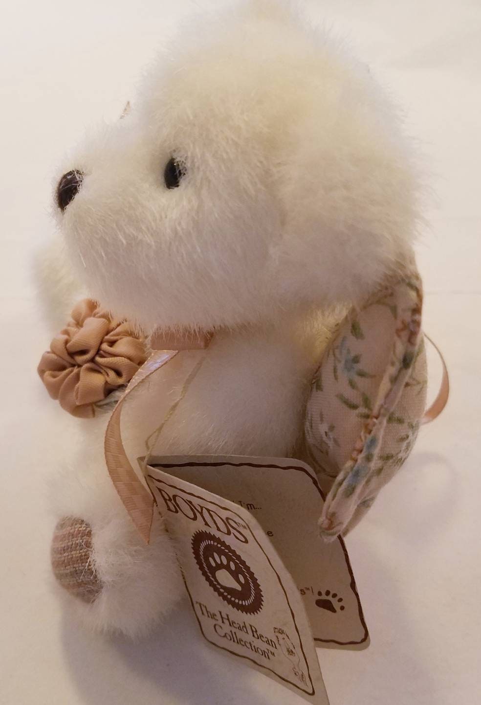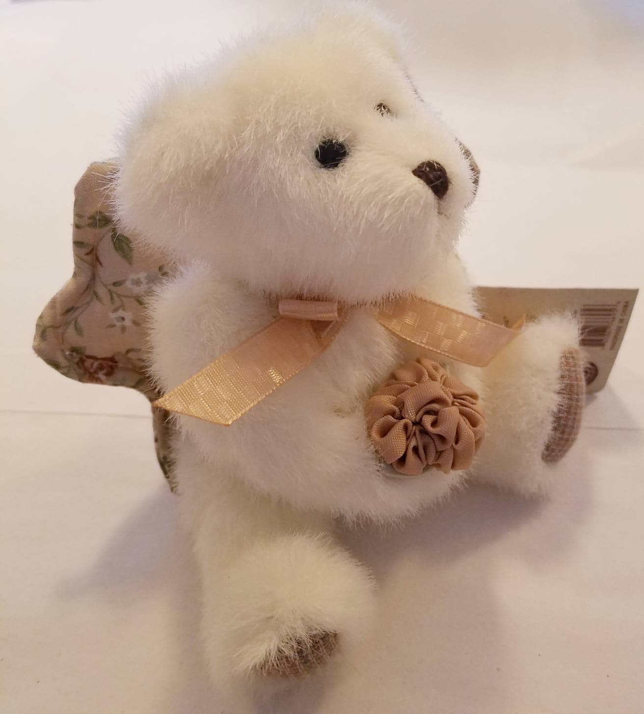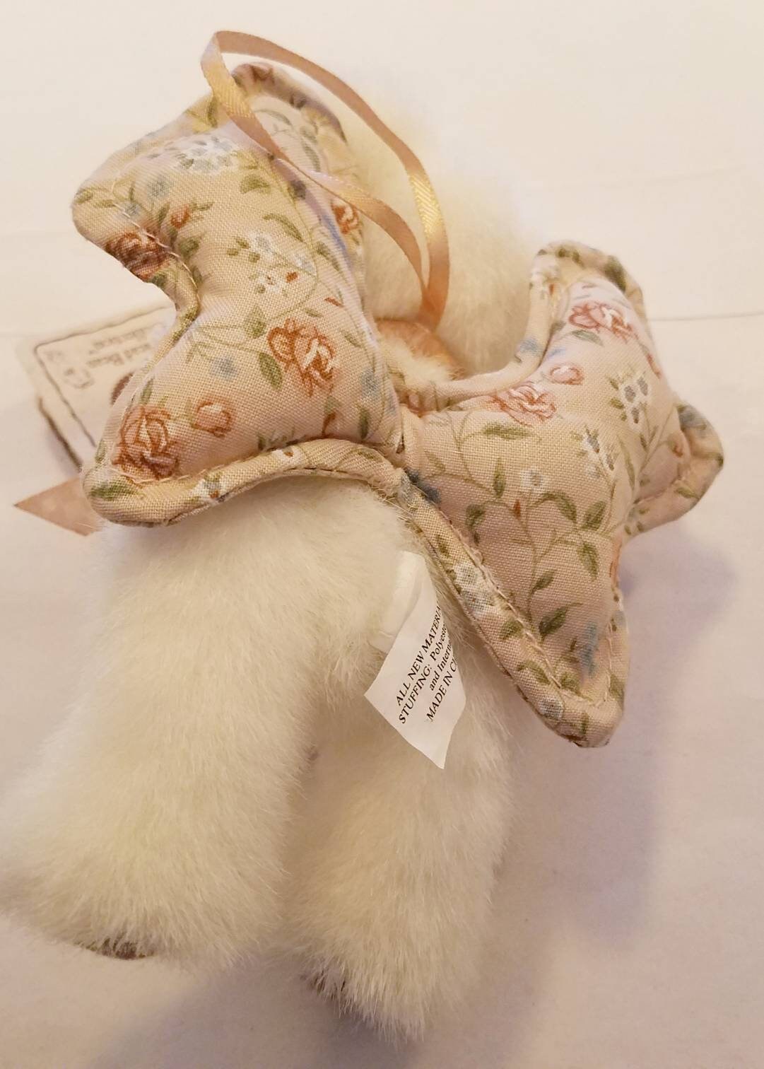 This cute plush Boyds Bear ornament named Ana Rose is from H. B.'s Heirloom Series and stands approximately 7" tall. She has soft white fur. The angel bear's arms and legs are jointed.