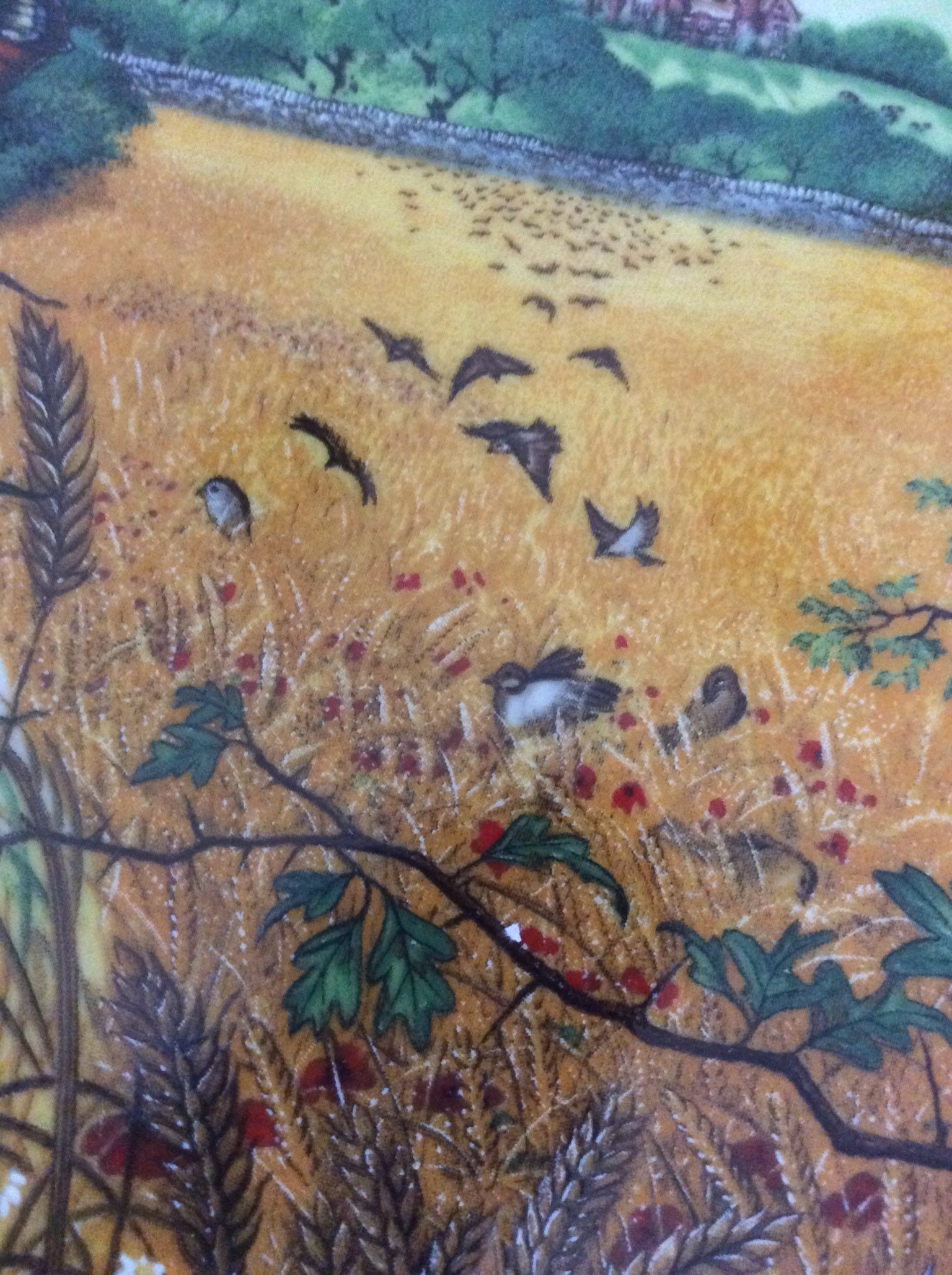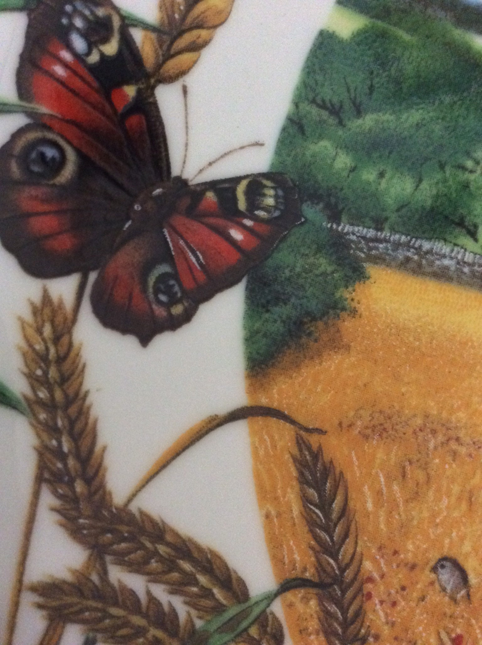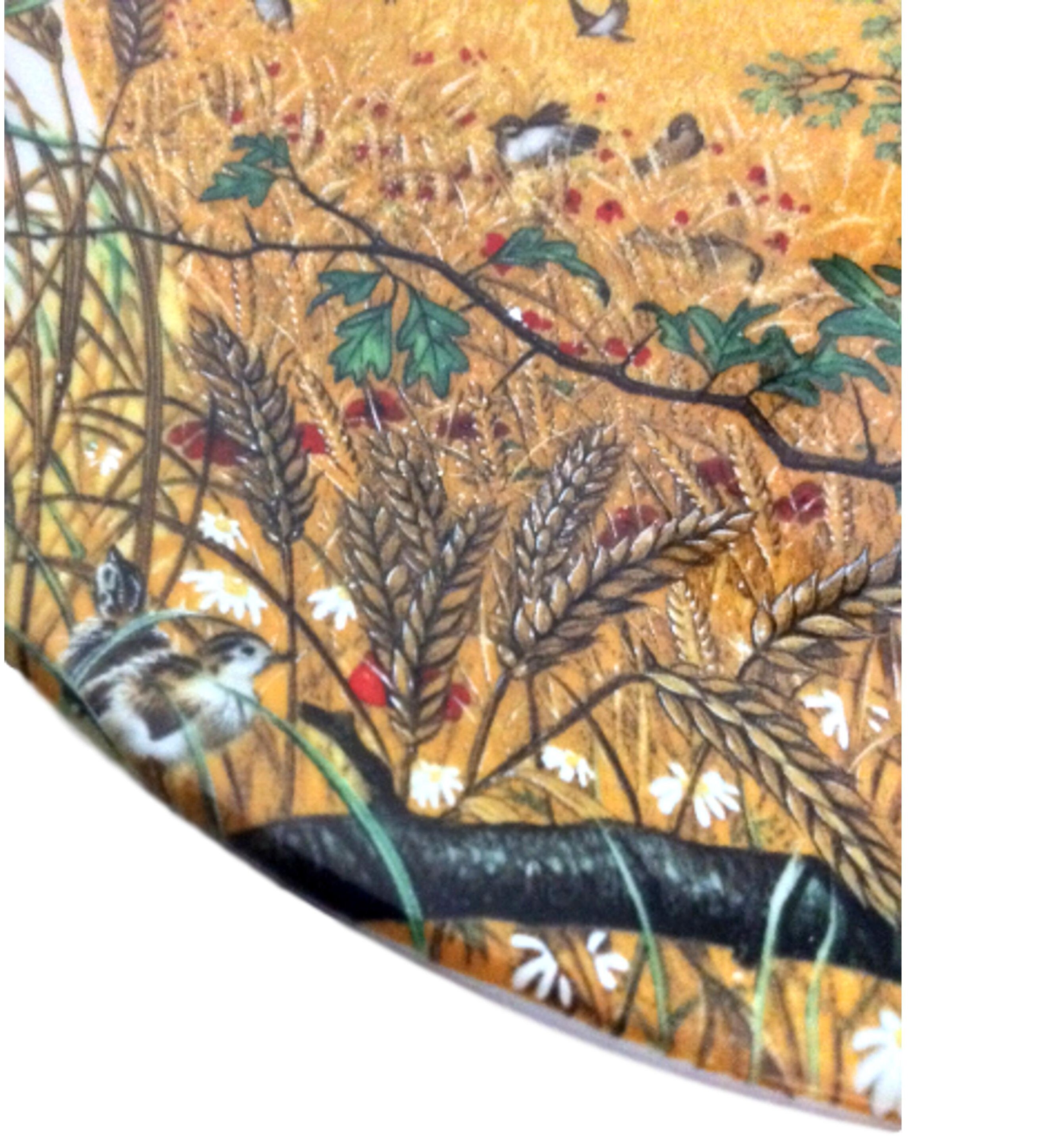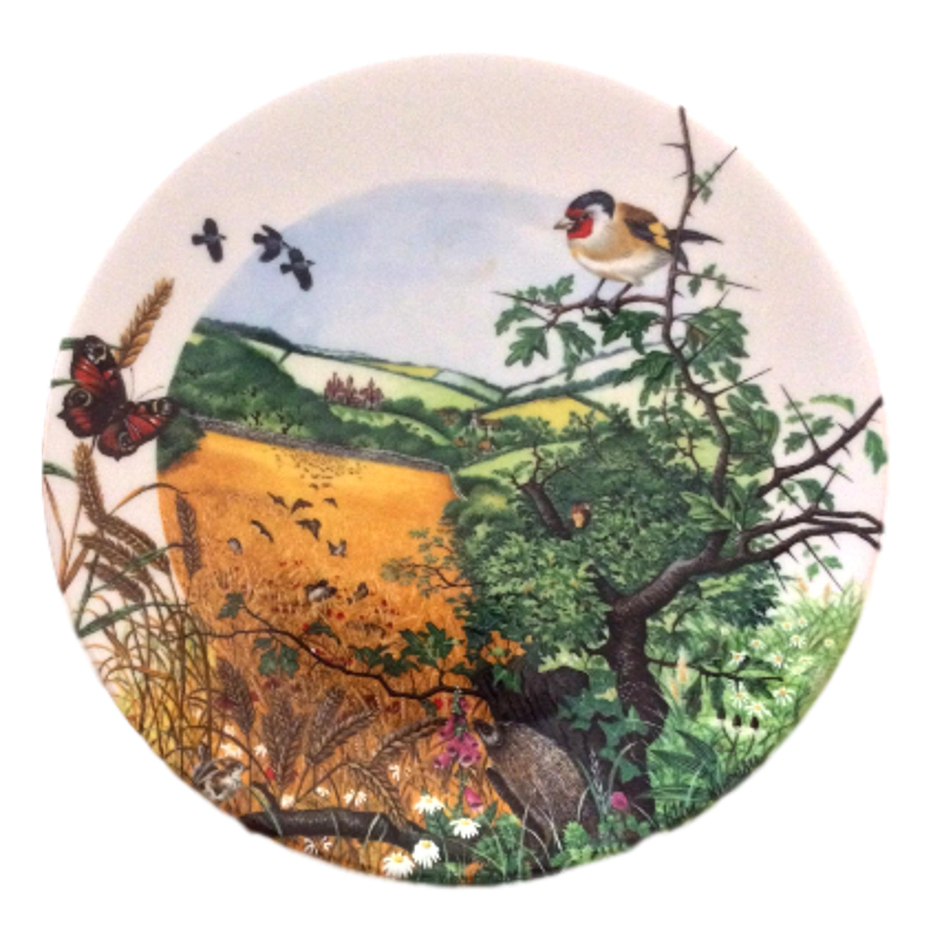 The stunning countryside plate features all kinds of wildlife such as birds, butterflies, and more in a wheat field.