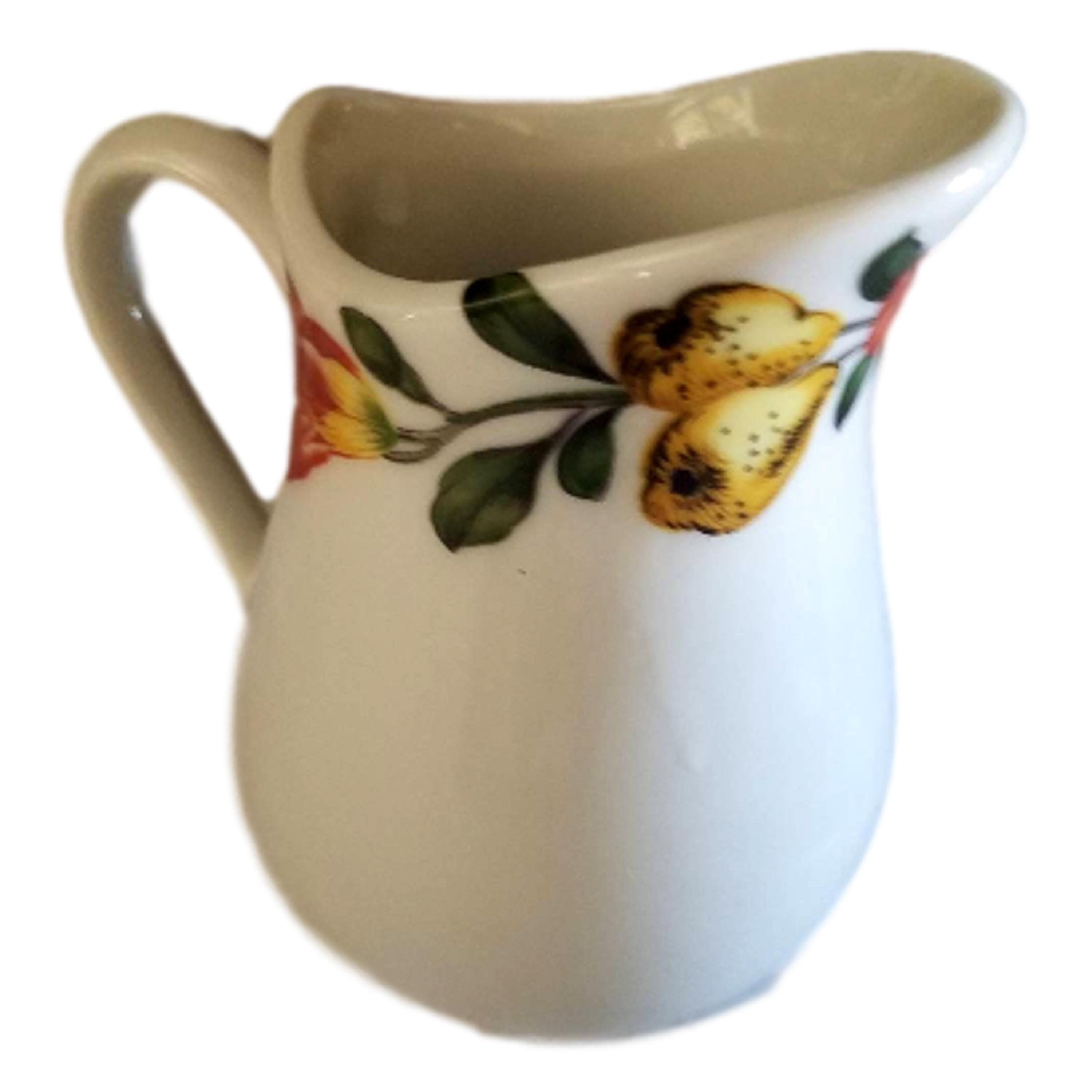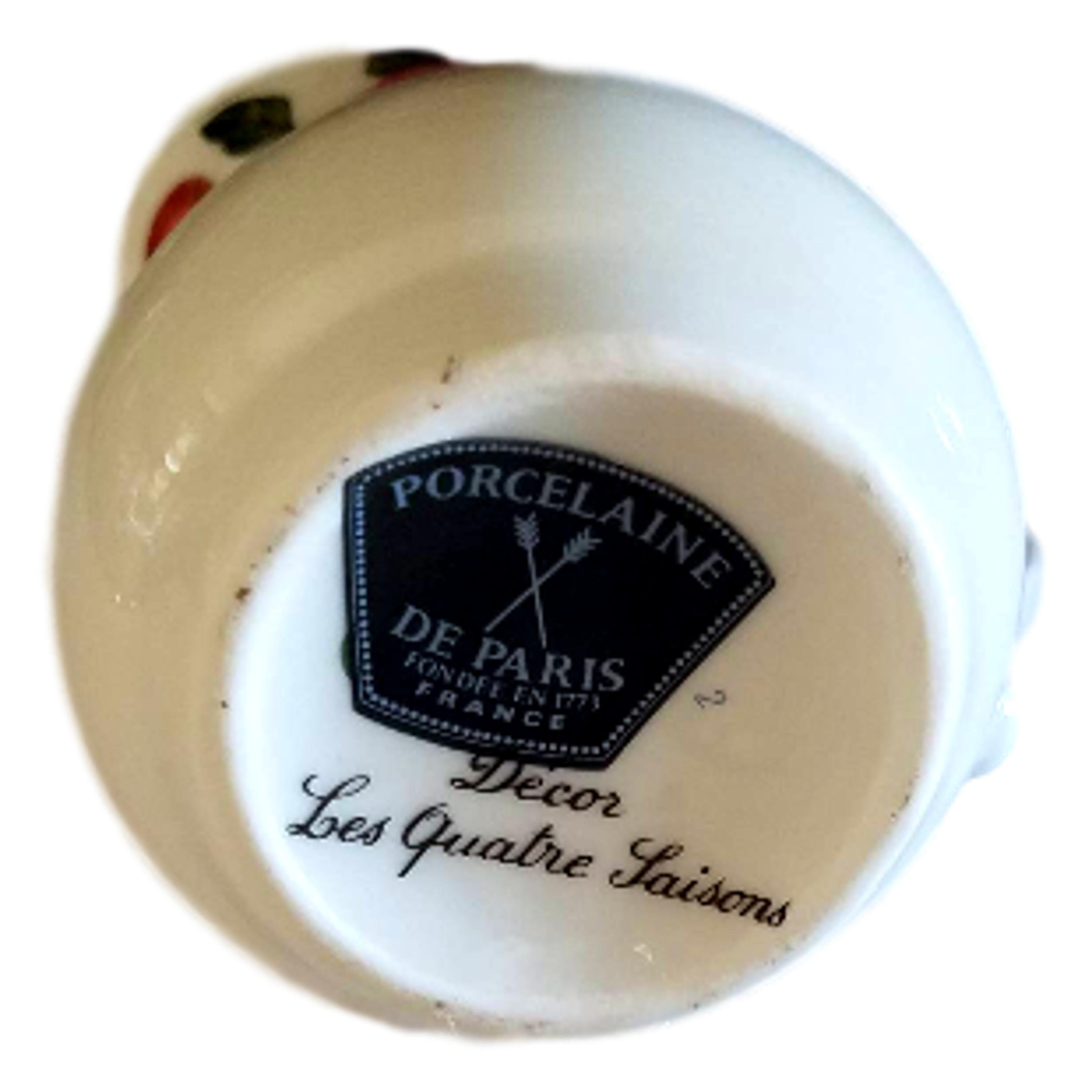 This is a French porcelain creamer. The pattern is Les Quatre Saisons. It was made in France. It is called Porcelaine de Paris. No imperfections that I can see. It measures 3.5" high. The little pitcher has beautiful flowers and fruit around the top.