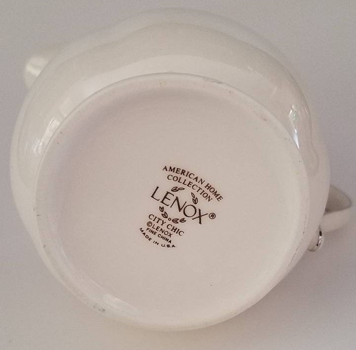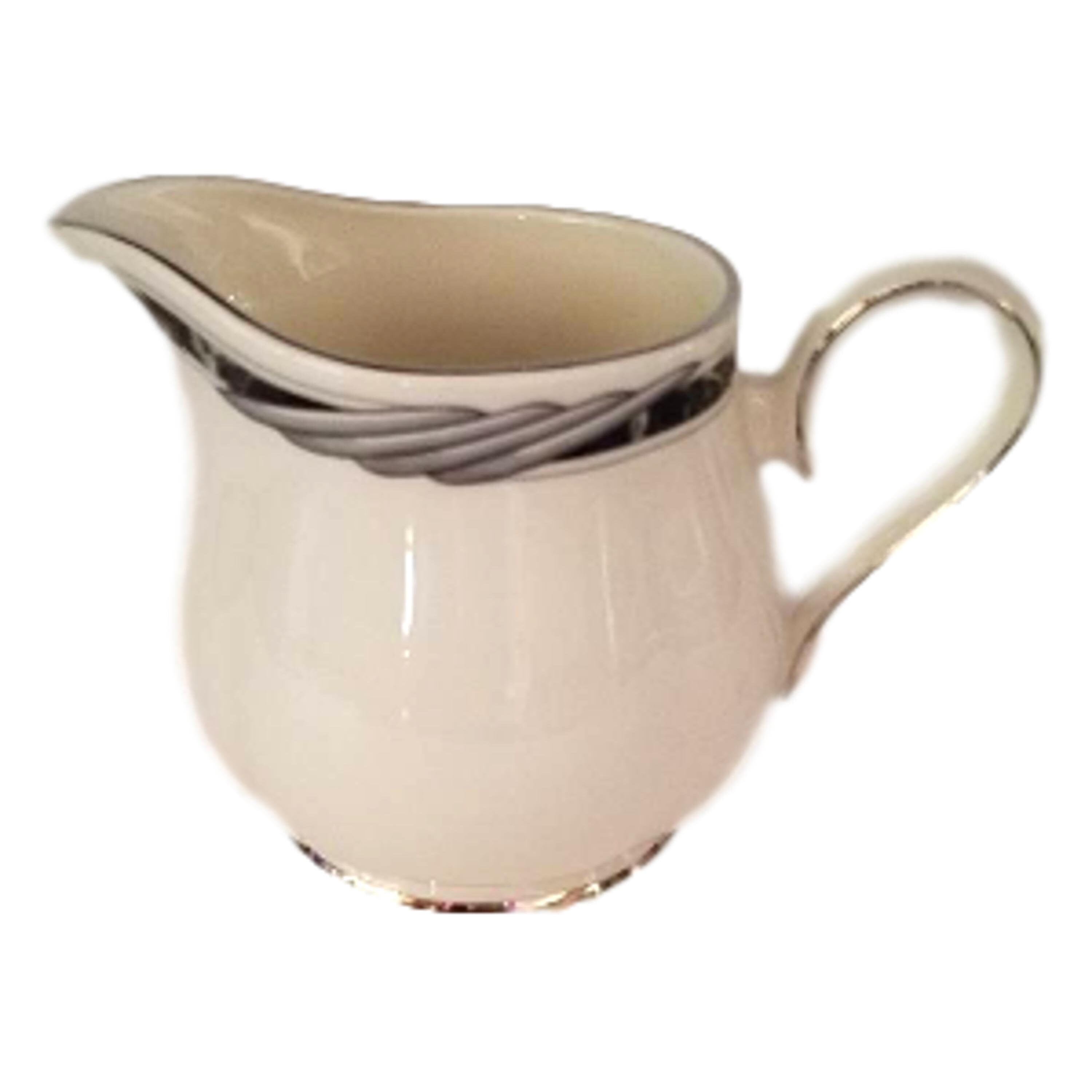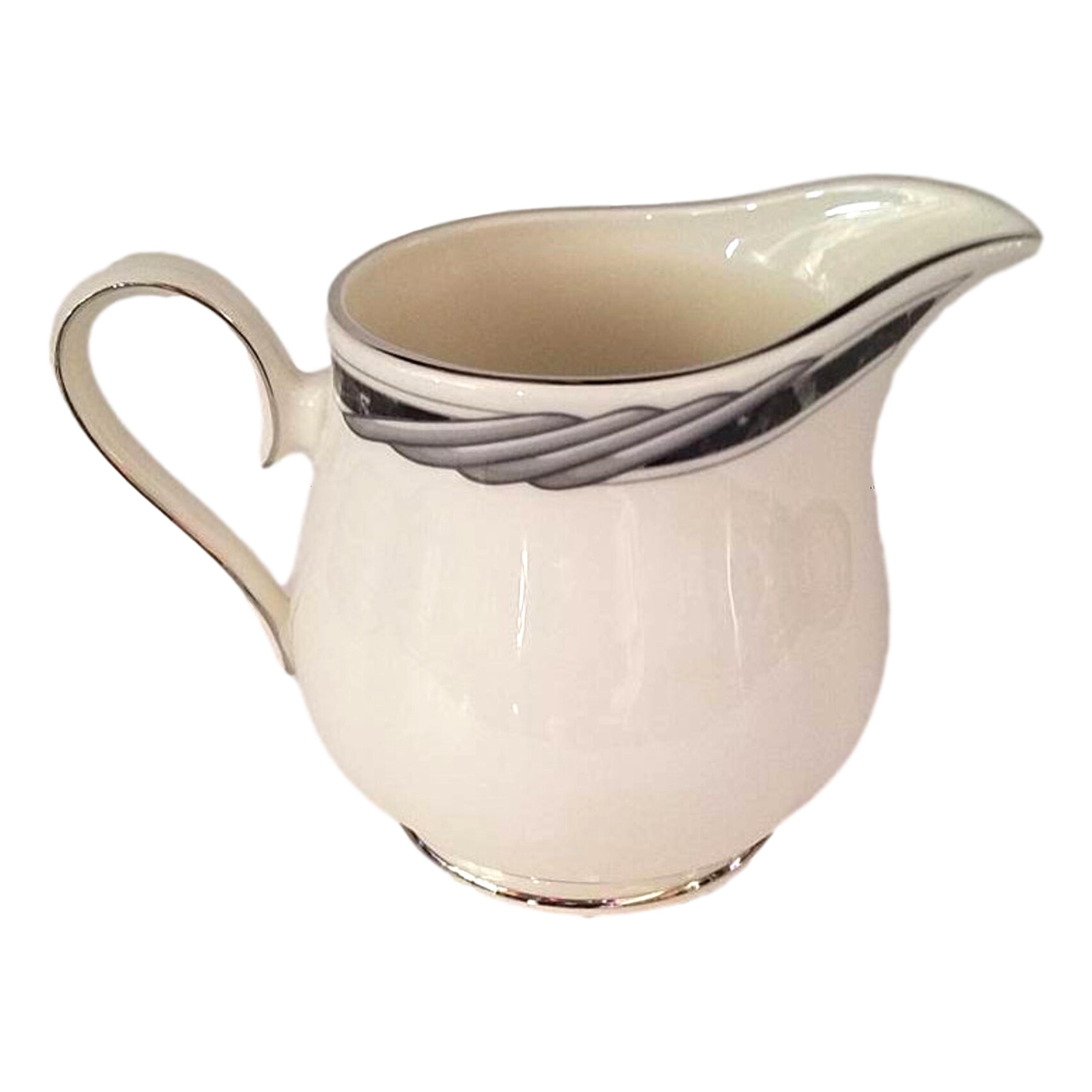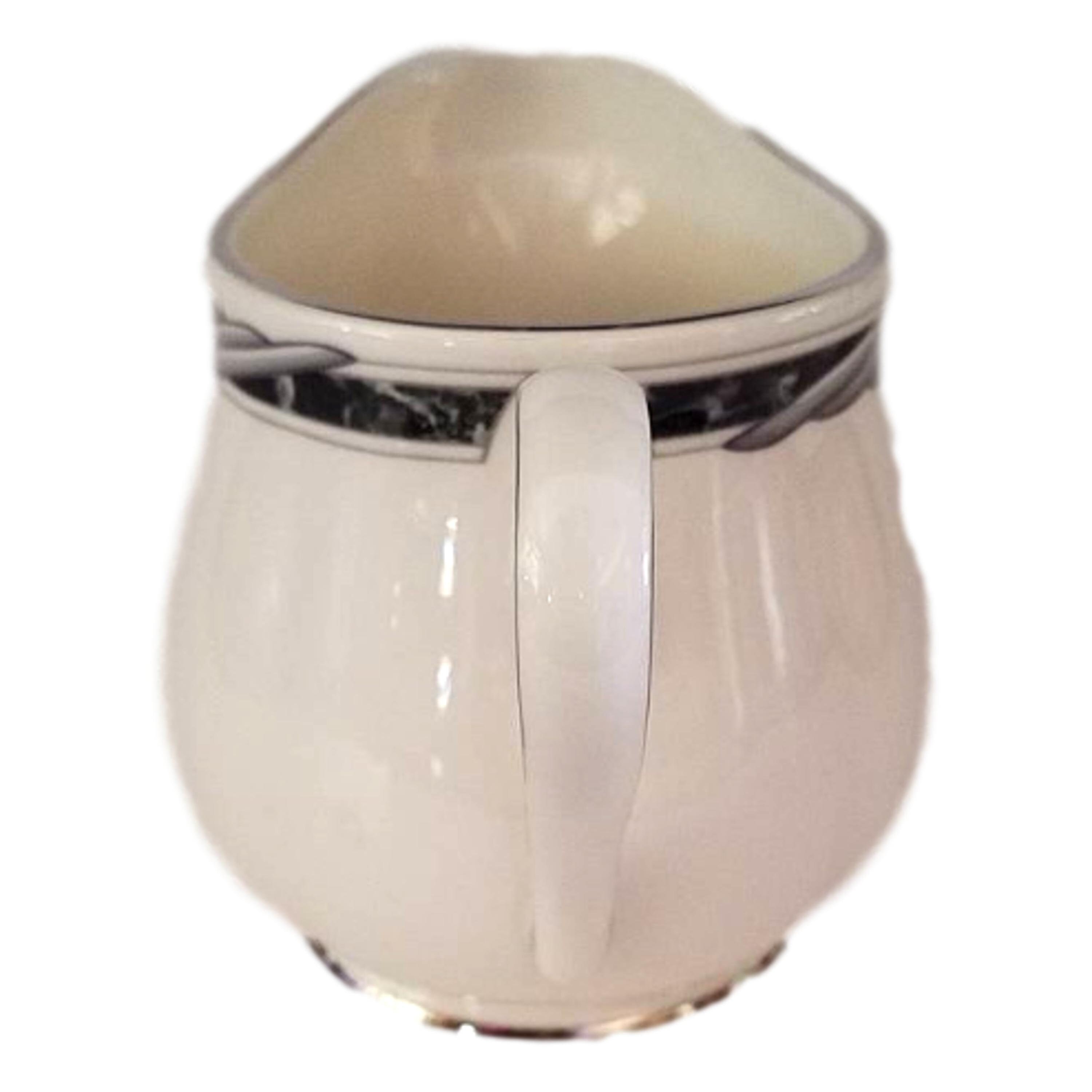 Fine China American Home Collection bone china creamer in the City Chick pattern. Fine china made in the USA. The creamer measures 3 1/2 inches in high and holds 8 fluid ounces. It appears unused. It has a floral design on a black and gray trim. The rim is platinum color.