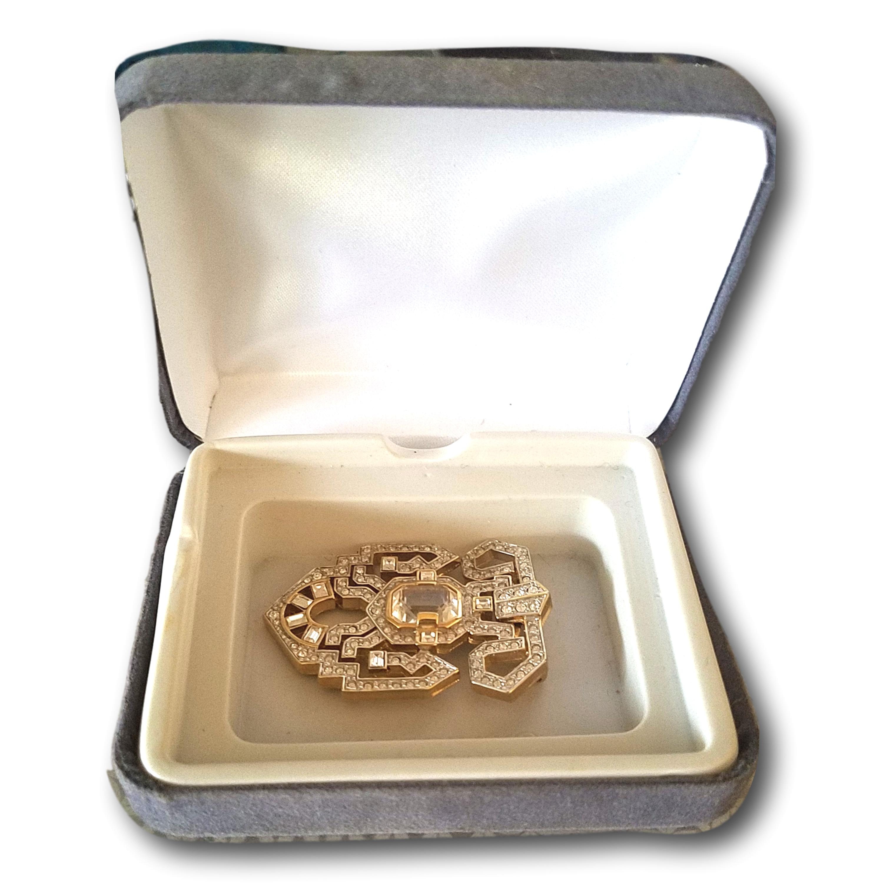 Add a touch of vintage elegance to your jewelry collection with this stunning Gold Star Valentine's Day Brooch by Carolee Creations. Featuring a dazzling array of silver crystals set in a luxurious gold tone pin, this jeweled brooch is perfect for elevating any outfit—whether it's a cozy sweater or a chic blouse. The intricate art deco design showcases timeless craftsmanship and eye-catching sparkle, making it a versatile accessory for any occasion.