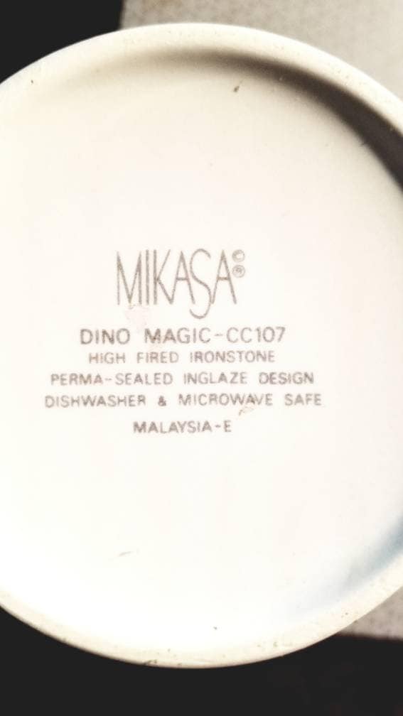 Mikasa China hot chocolate mug for children. Great Christmas gift for children. The ironstone cup has purple, pink and green dinosaurs. Dishwasher and microwave safe. Measures 5 inches high. Flat, easy-to-hold handle. Very good like new condition.