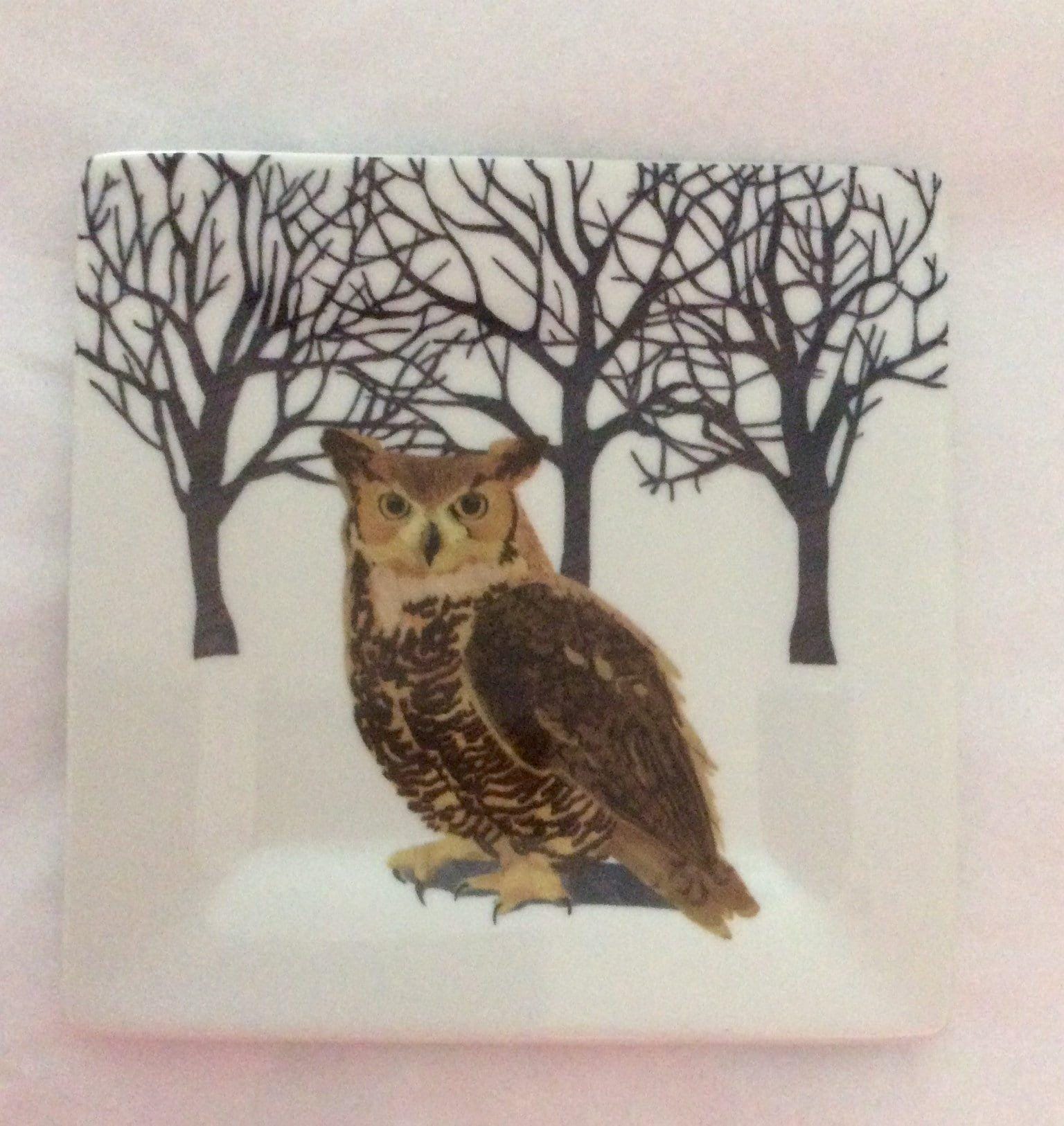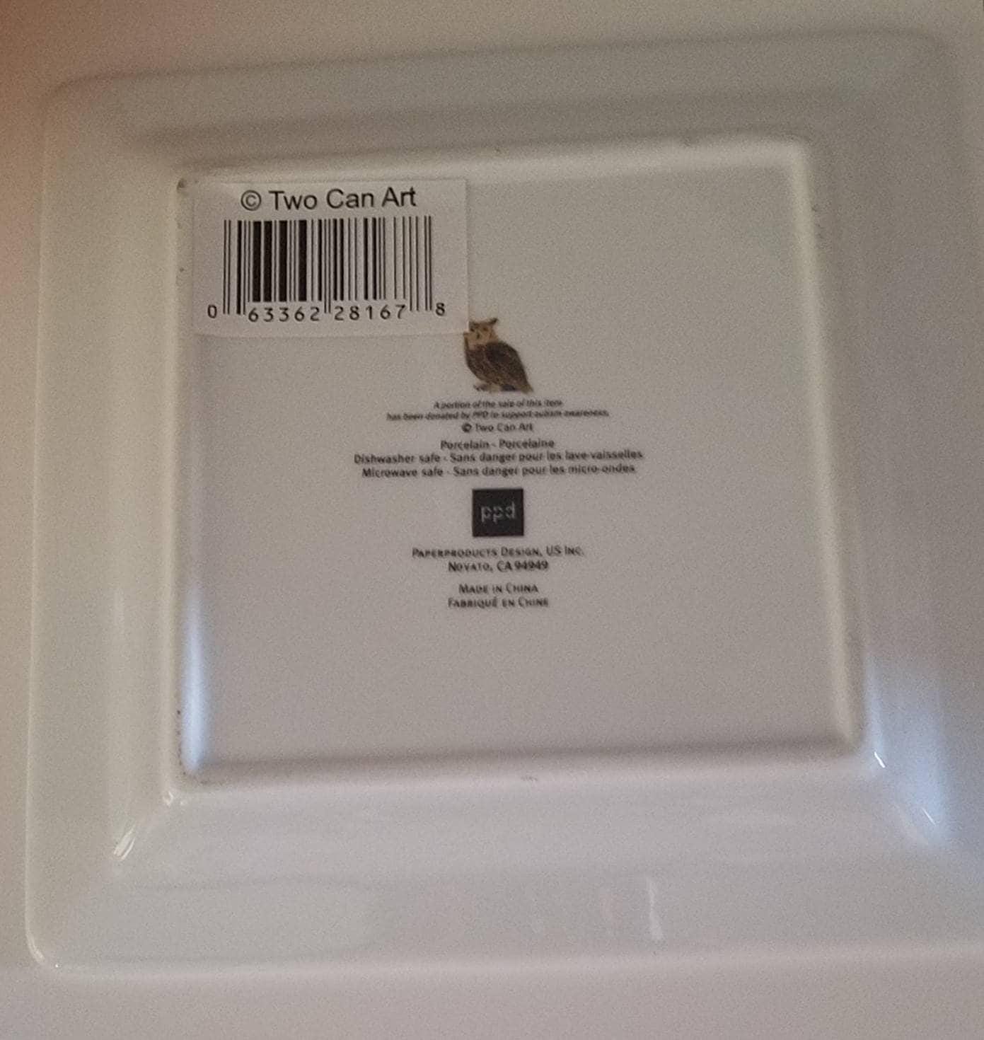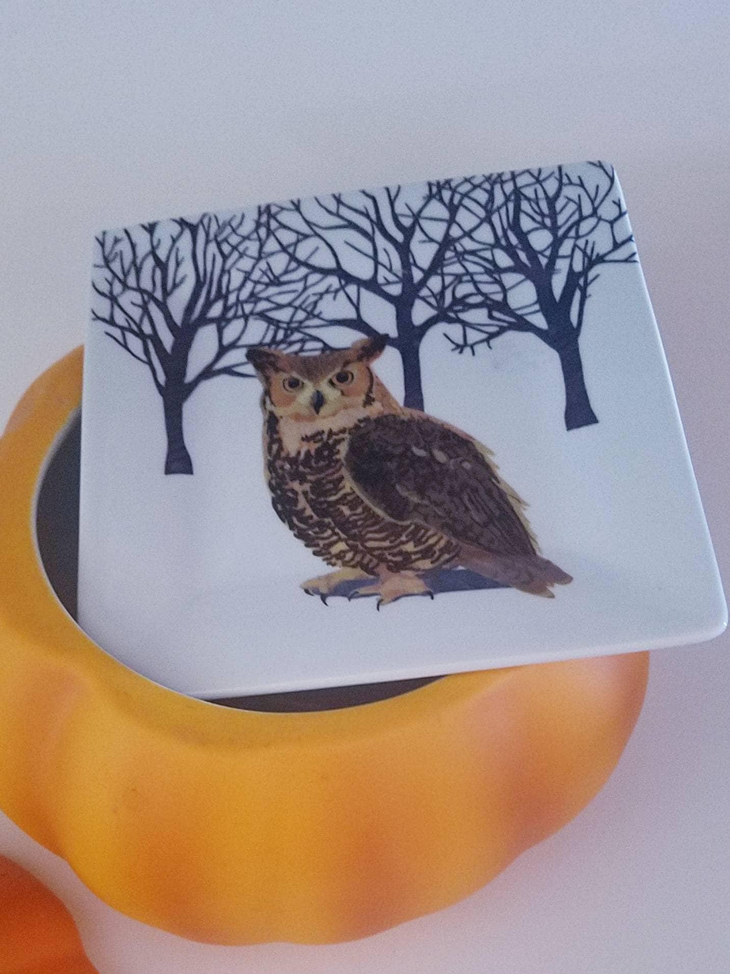 Set of two (2) square barn owl cute porcelain salad plates. The plates feature a barn owl sitting in front of three leafless trees. The plates measure 5.5" x 5.5" and have not been used. The bird ceramics plates are dishwasher and microwave safe. Great bird lover. Add your item to the cart now!
