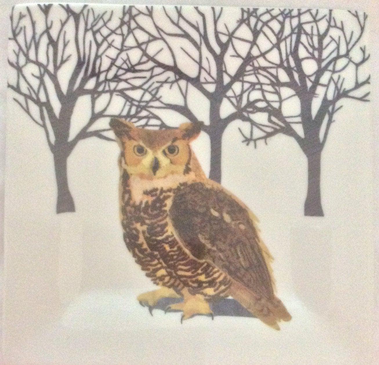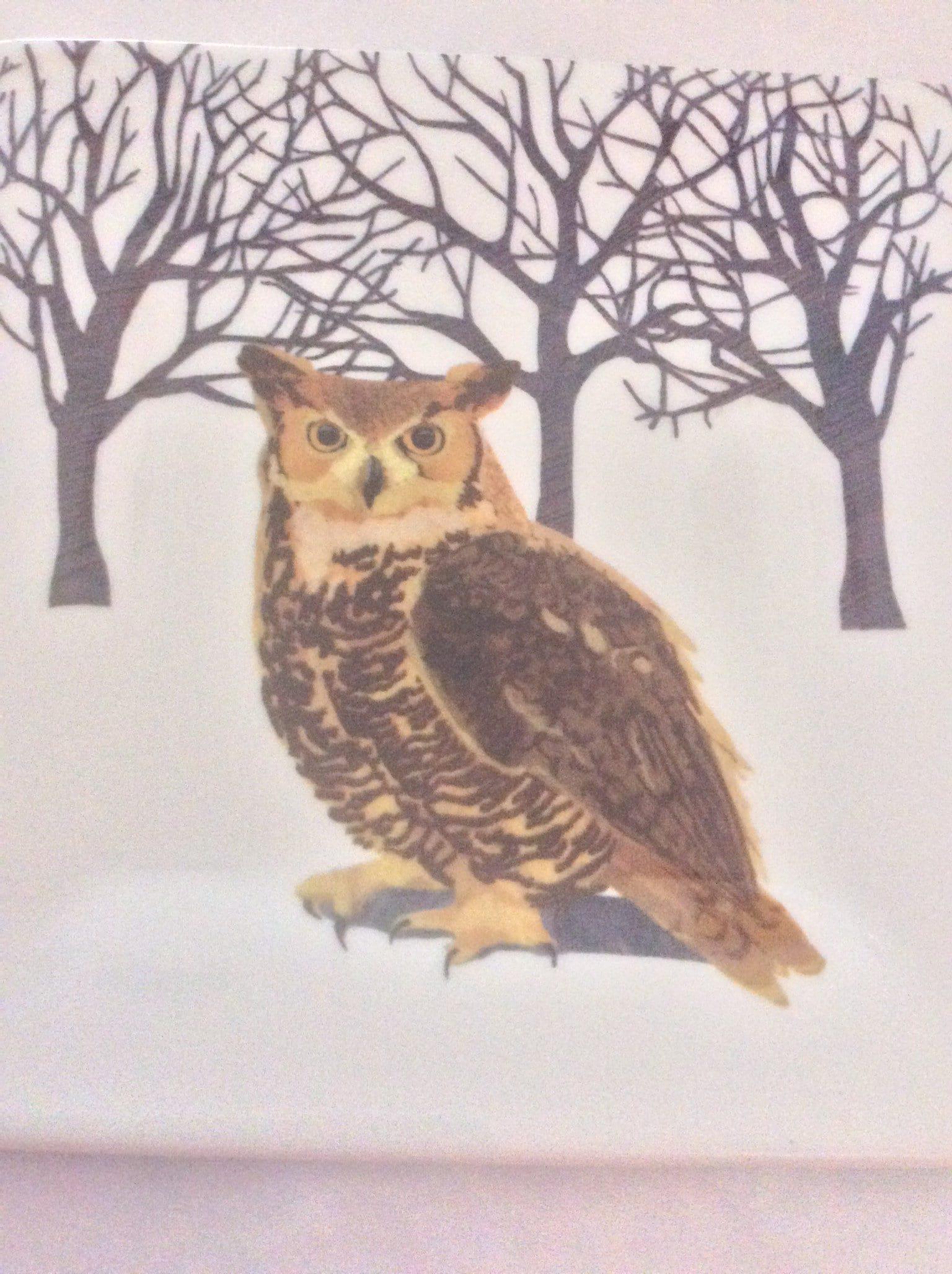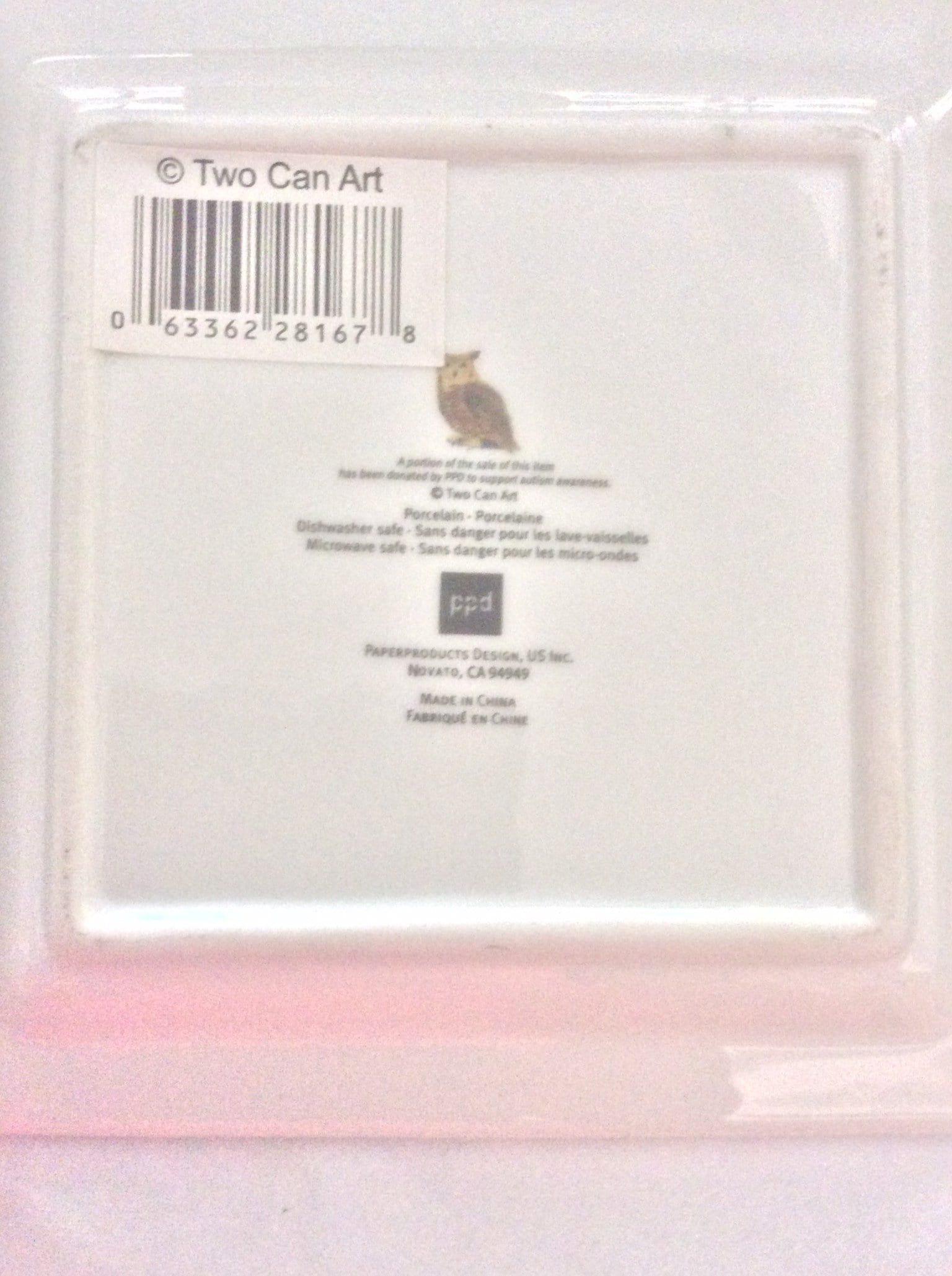 Set of two (2) square barn owl cute porcelain salad plates. The plates feature a barn owl sitting in front of three leafless trees. The plates measure 5.5" x 5.5" and have not been used. The bird ceramics plates are dishwasher and microwave safe. Great bird lover. Add your item to the cart now!