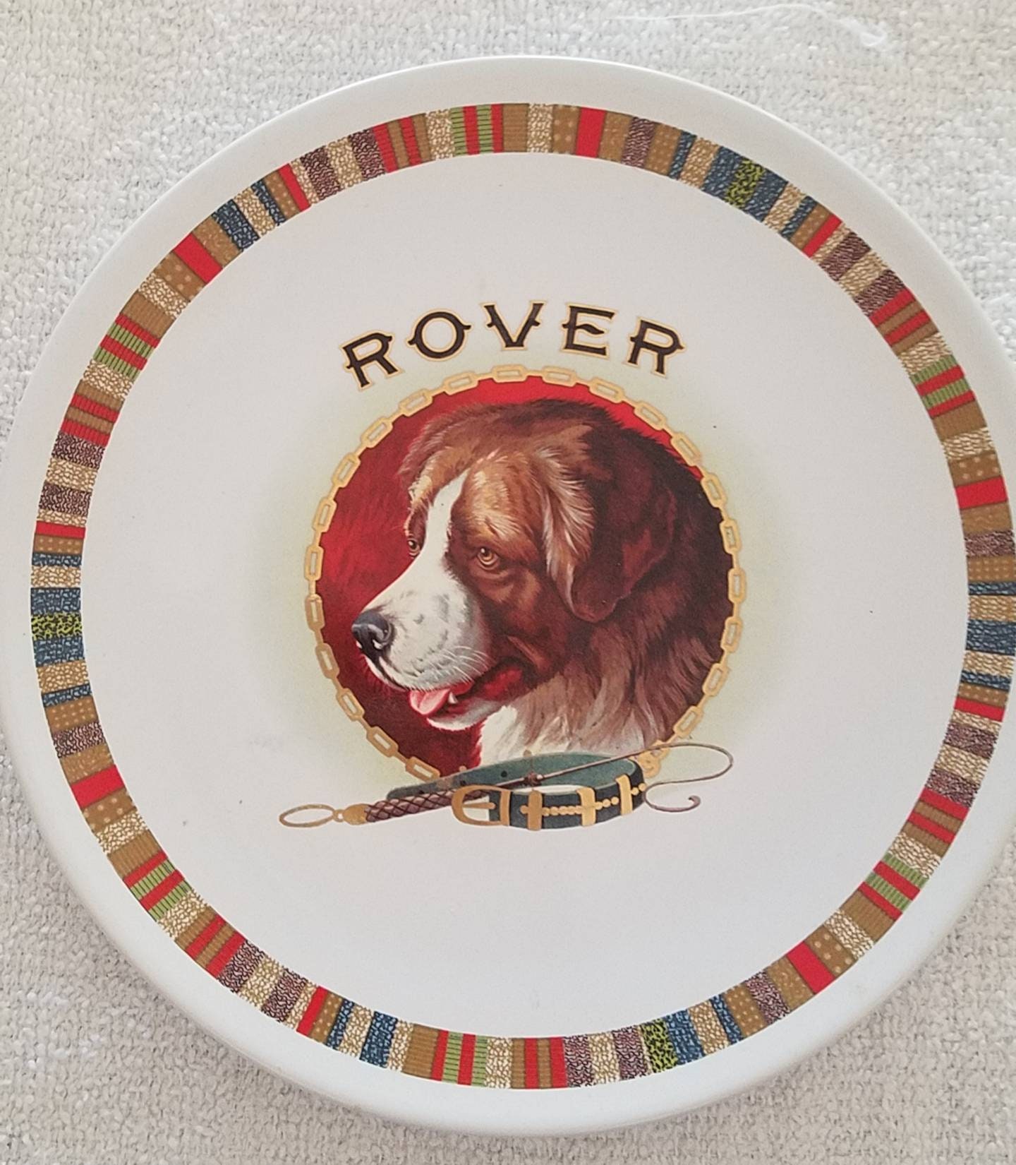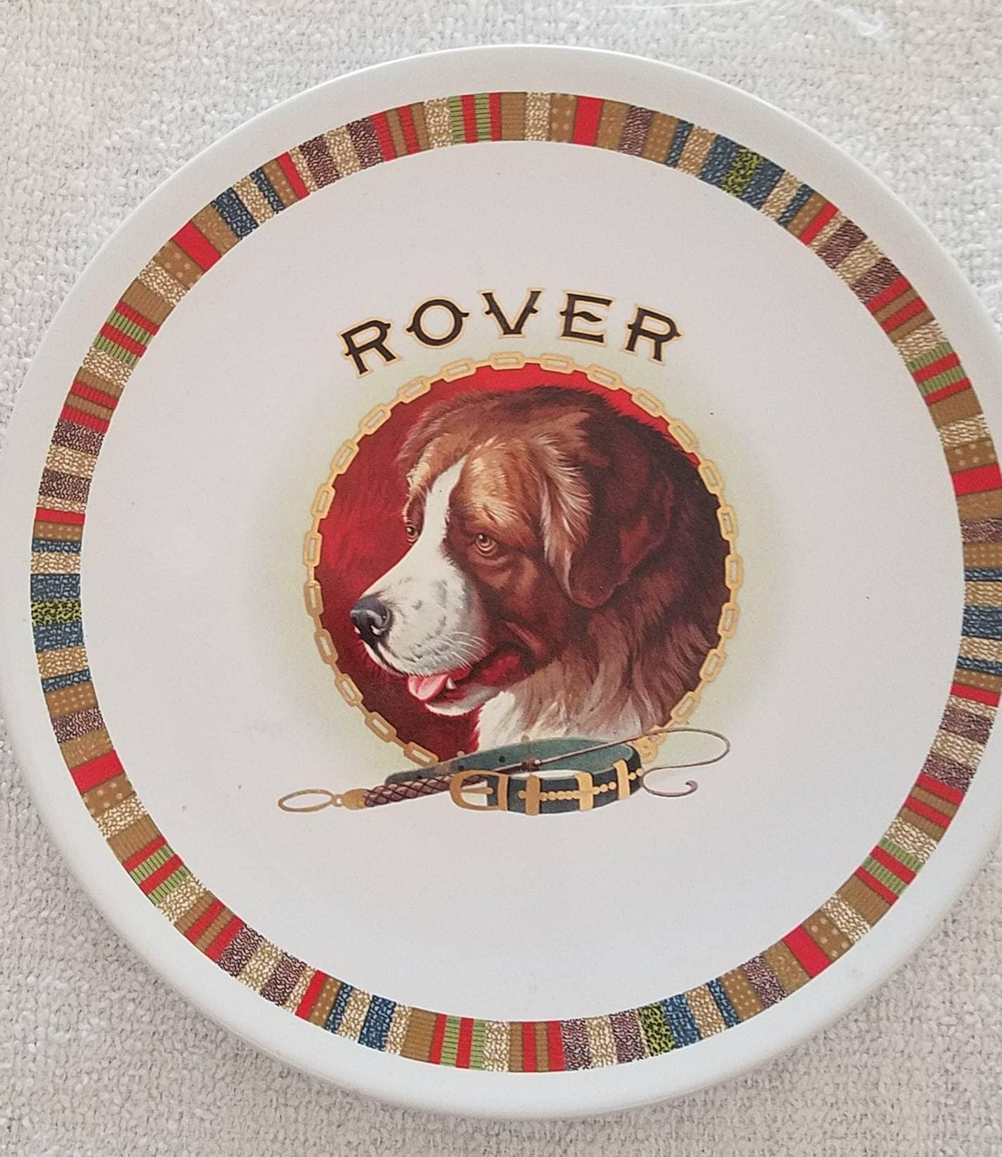 Pottery Barn Fireside Club dog wall plate. This is a Saint Bernard dog ceramic plate named Rover. This ceramic plate is dishwasher safe. It measures 8 1/4" in diameter. It is gently used and in very good condition. Do not use in the microwave. It features a head shot of the Saint Bernard and the plate has a geometric band near the rim. This would make a great dog lover gift.