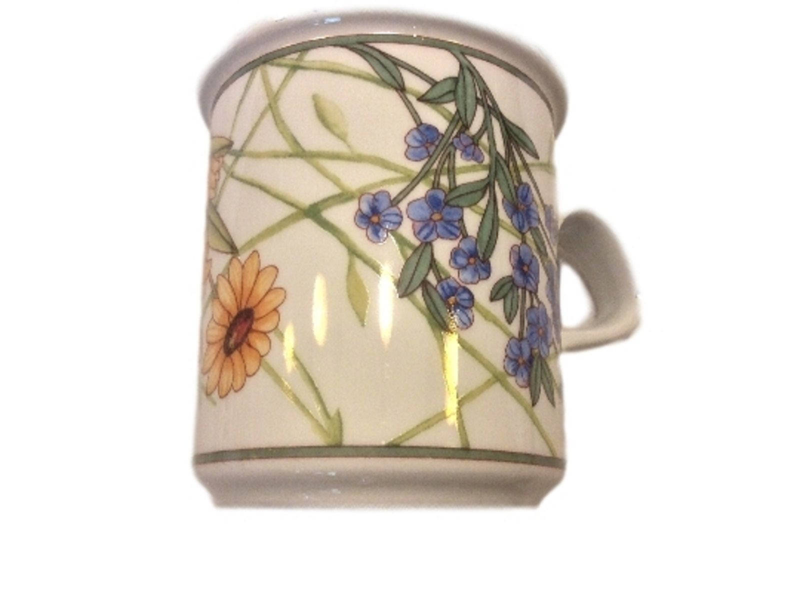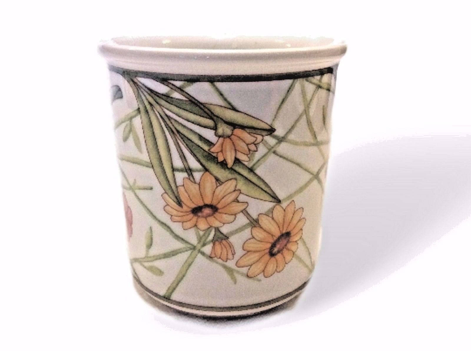 Vintage Dansk Dishes International Porcelain Coffee Mug in the Cafe Floral pattern. It features multicolored flowers with green bands. It is a discontinued pattern.