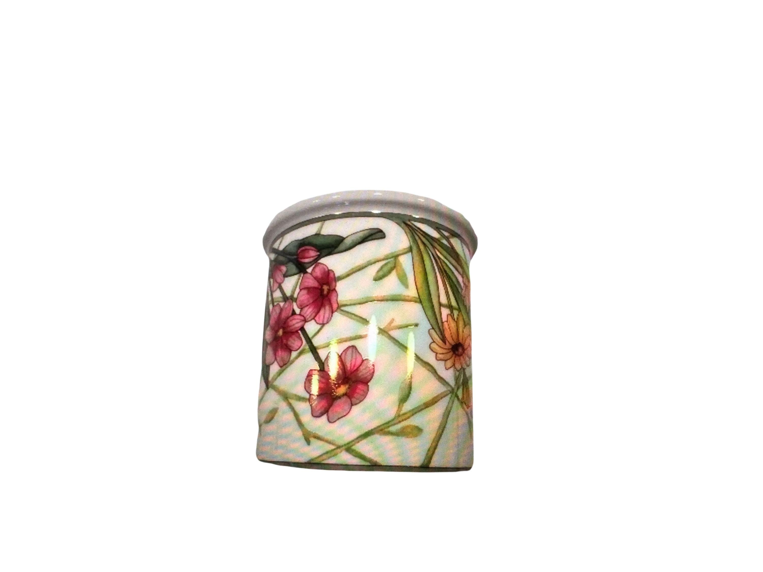 Vintage Dansk floral coffee mug in the Cafe Floral pattern. It features multicolored flowers with green bands. It is a discontinued pattern.