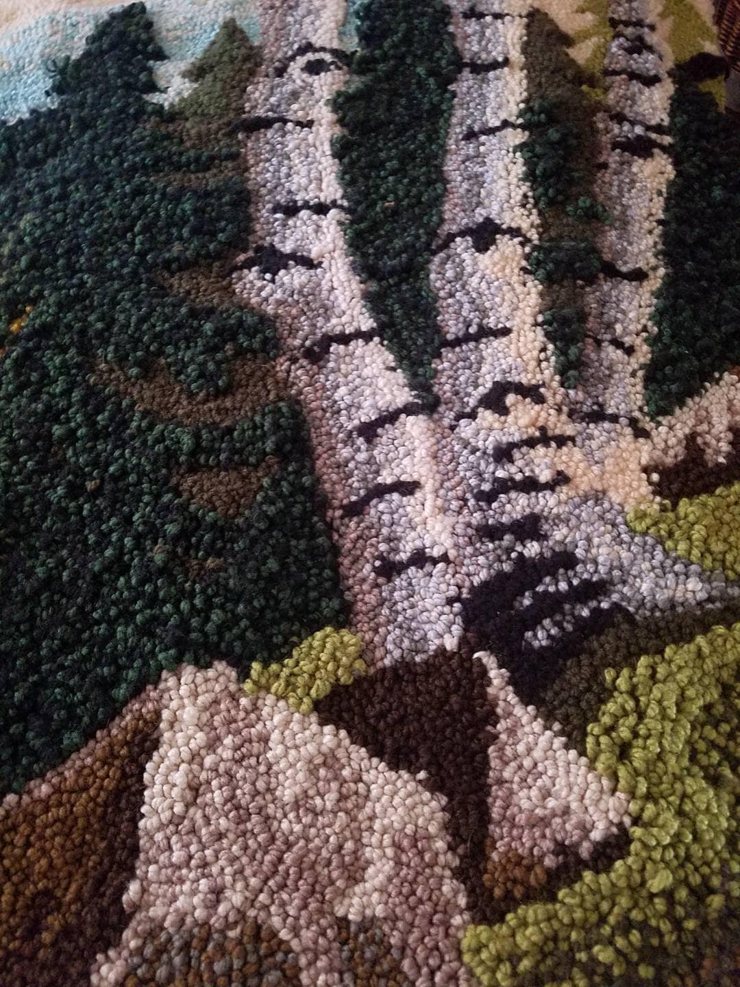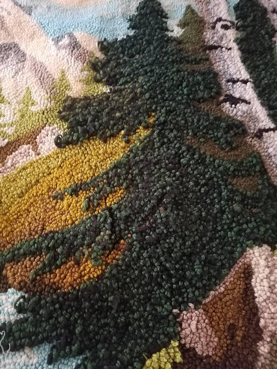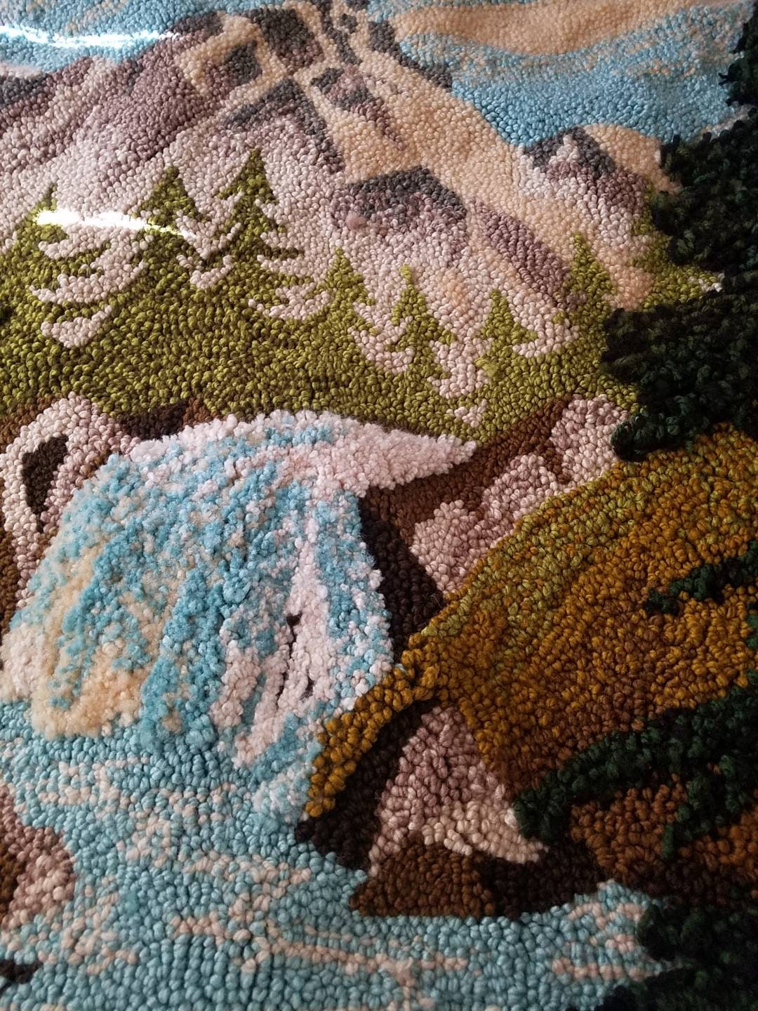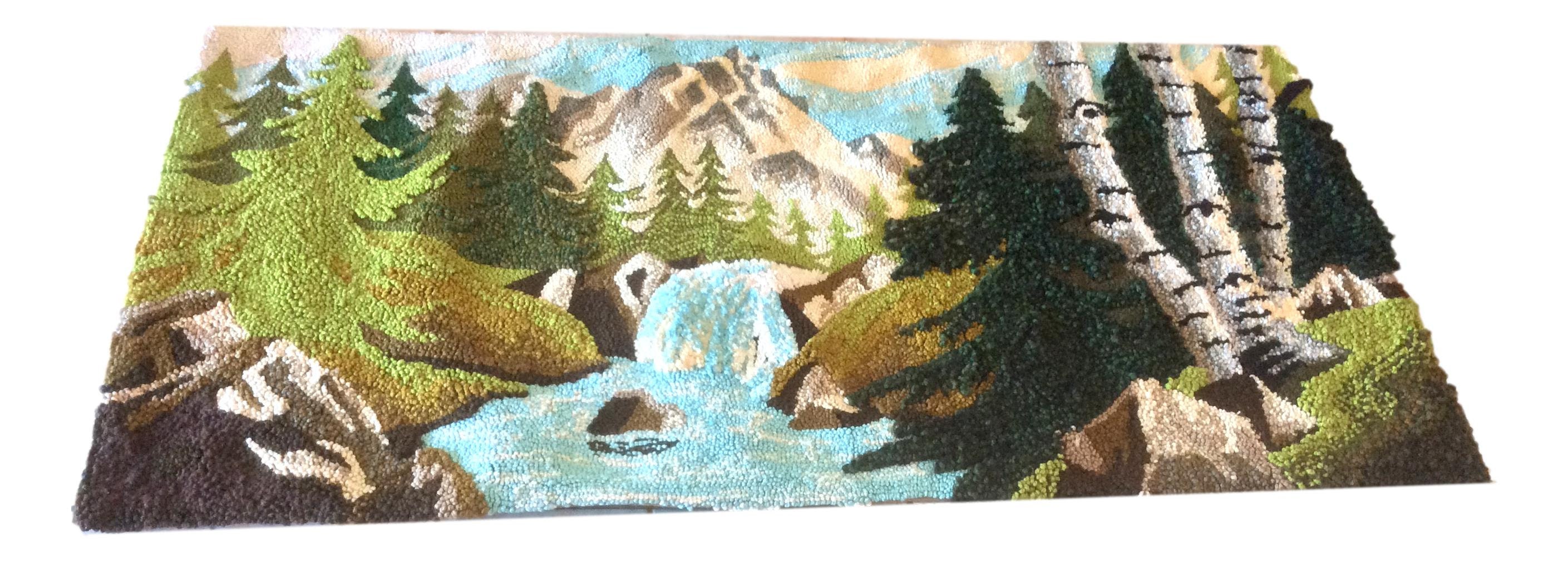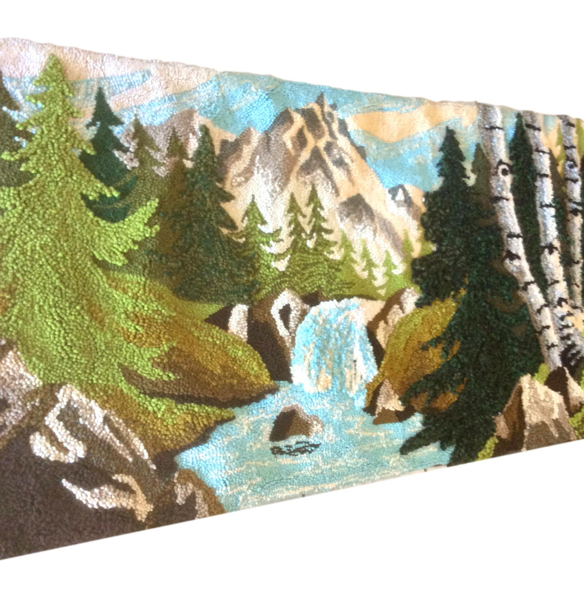 Vintage Scenic Mountain Waterfall Latch Hook Rug Wall Hanging or Area Rug 36" x 72" Hand Made Tapestry, Pine Trees, Aspen, 3D Effect