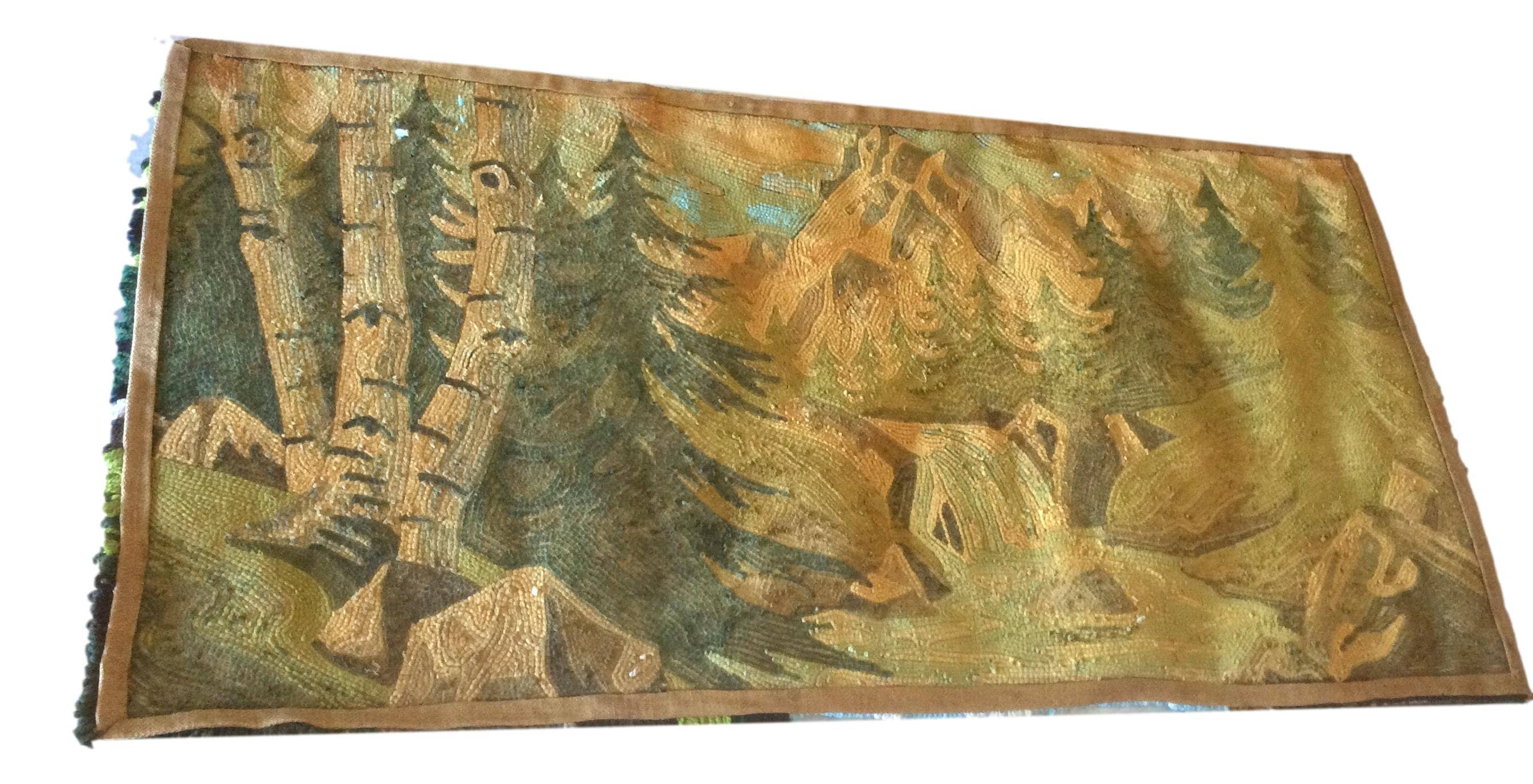 Perfect as a wall hanging, this hand-hooked rug adds a cozy, rustic charm to any space. Its durable craftsmanship and vibrant scenic print make it a unique statement piece that celebrates nature’s serenity. The rug has been professionally crafted and has remained in excellent, clean vintage condition. It has never been used on the floor, only displayed as a beautiful wall art piece.
