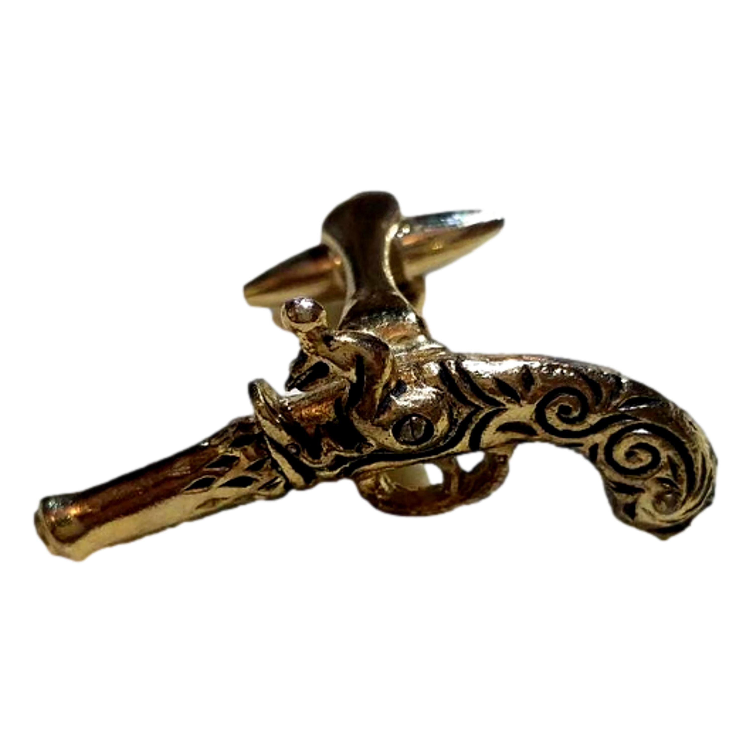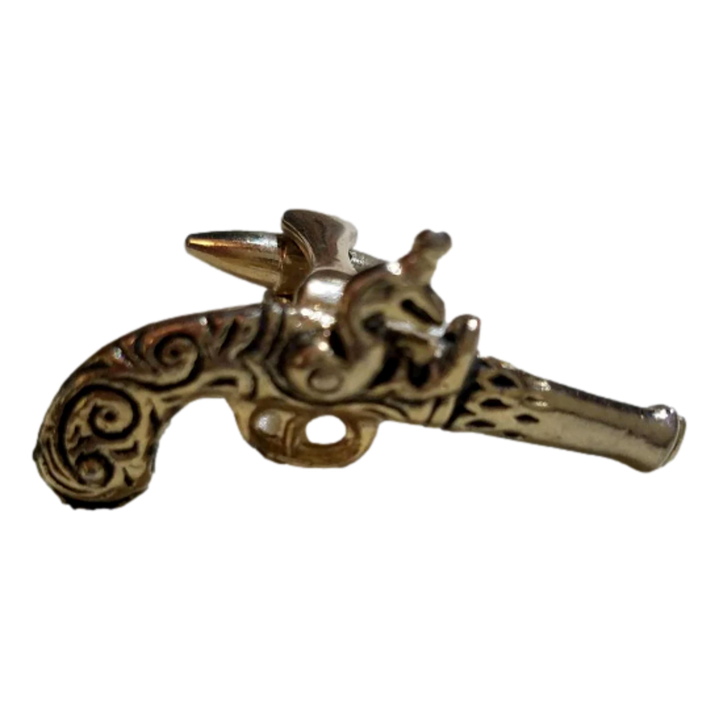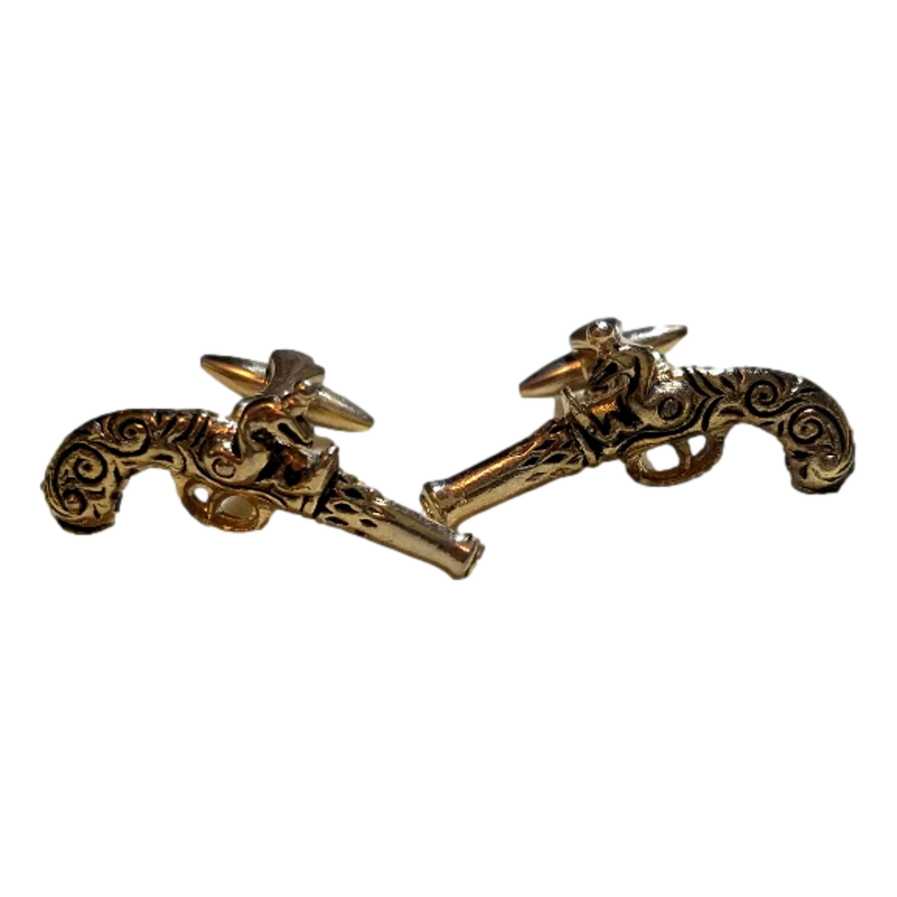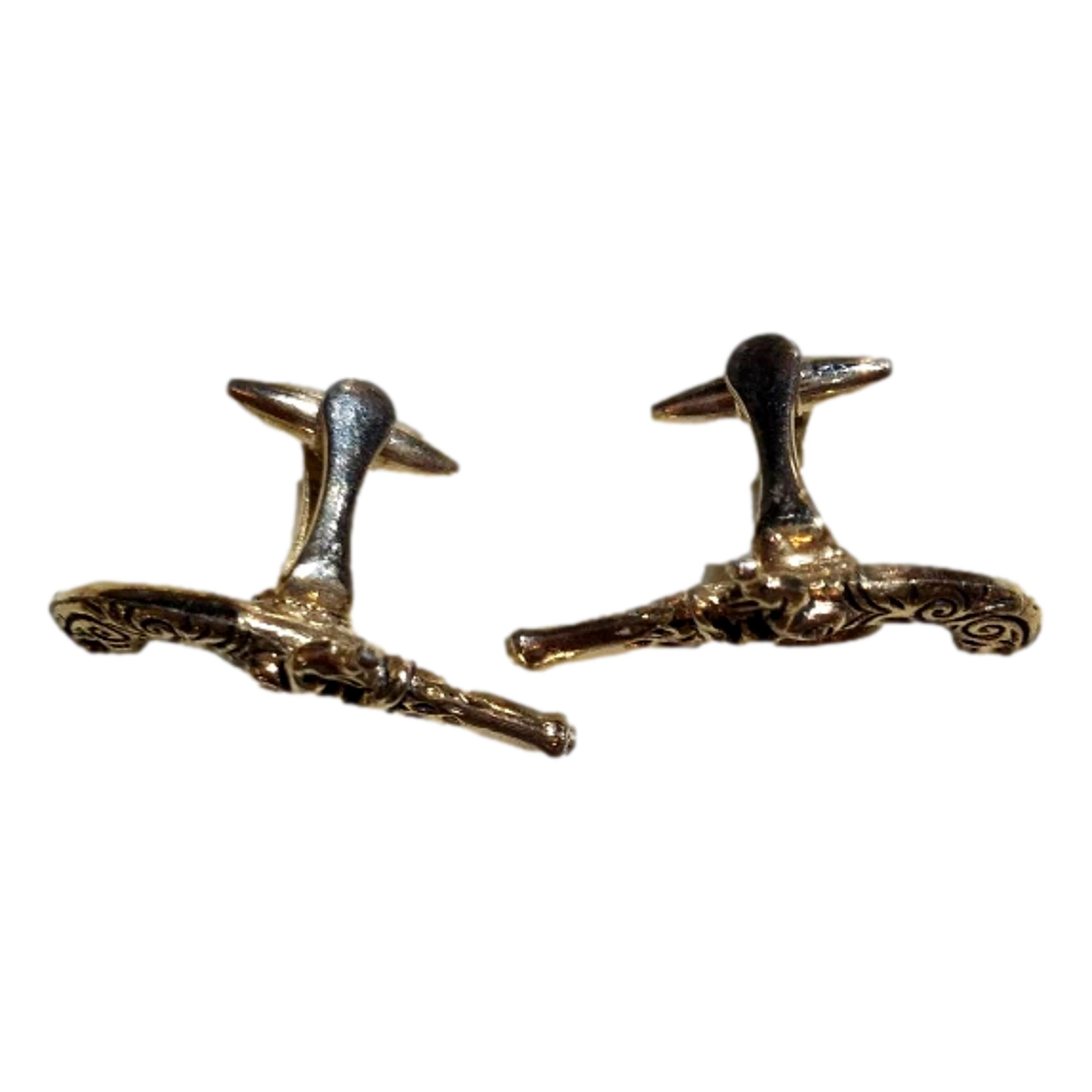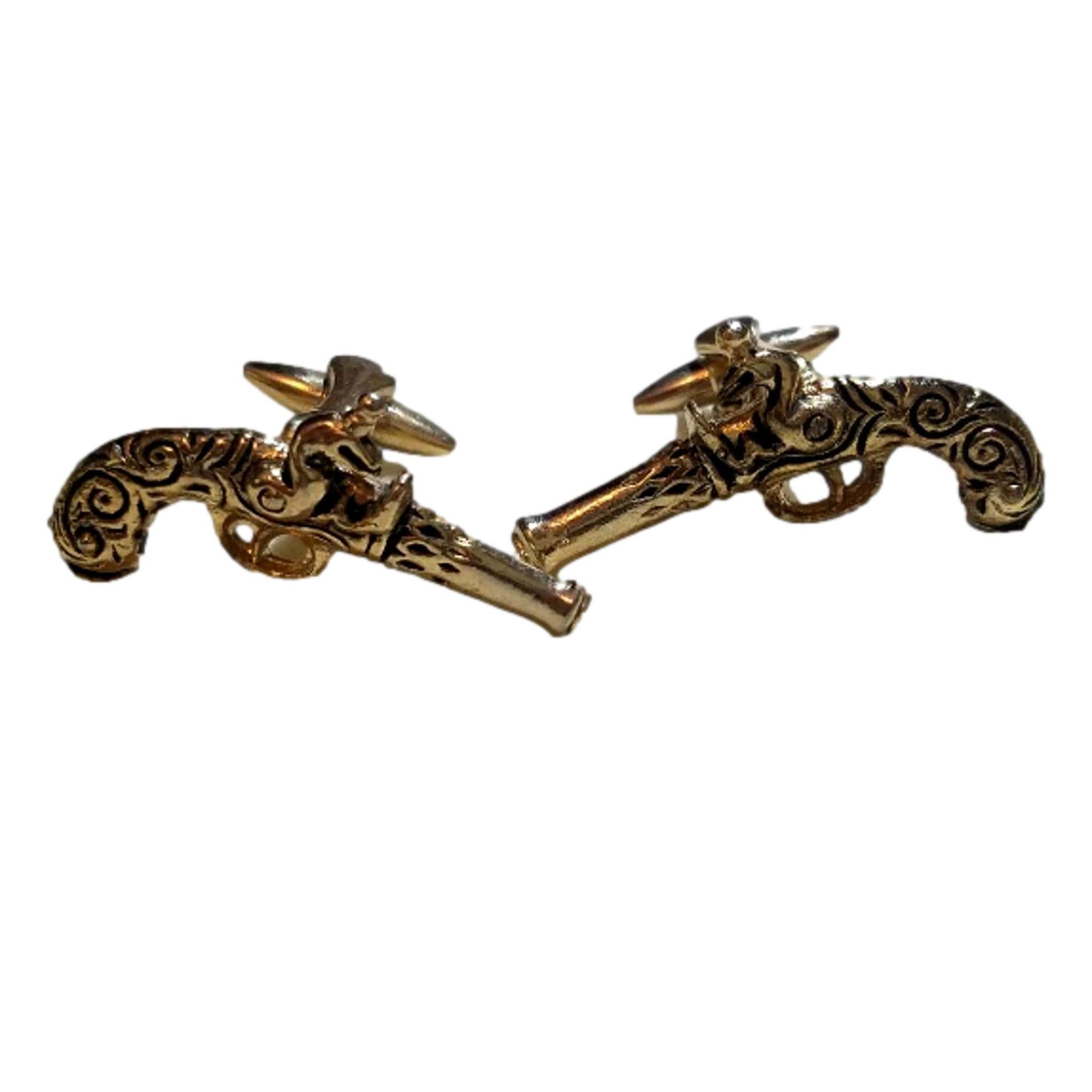 Special gift for him are these miniature men's flintlock gun cufflinks would be a great gift under $50. These pistol gun cuff links are Stratton of England men's gold tone, flintlock cuff links. The vintage steampunk gun cuff links are from the 1950's. They are in stunning, like new condition. No indication of metal content. Inscribed with the word "metal" on the inside. The measure approximately 2 inches in length. They appear to be brass like.