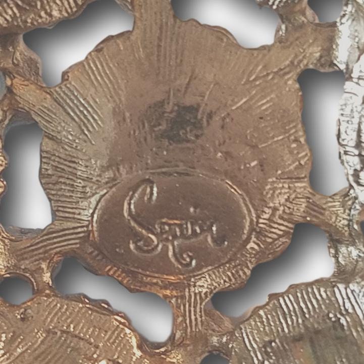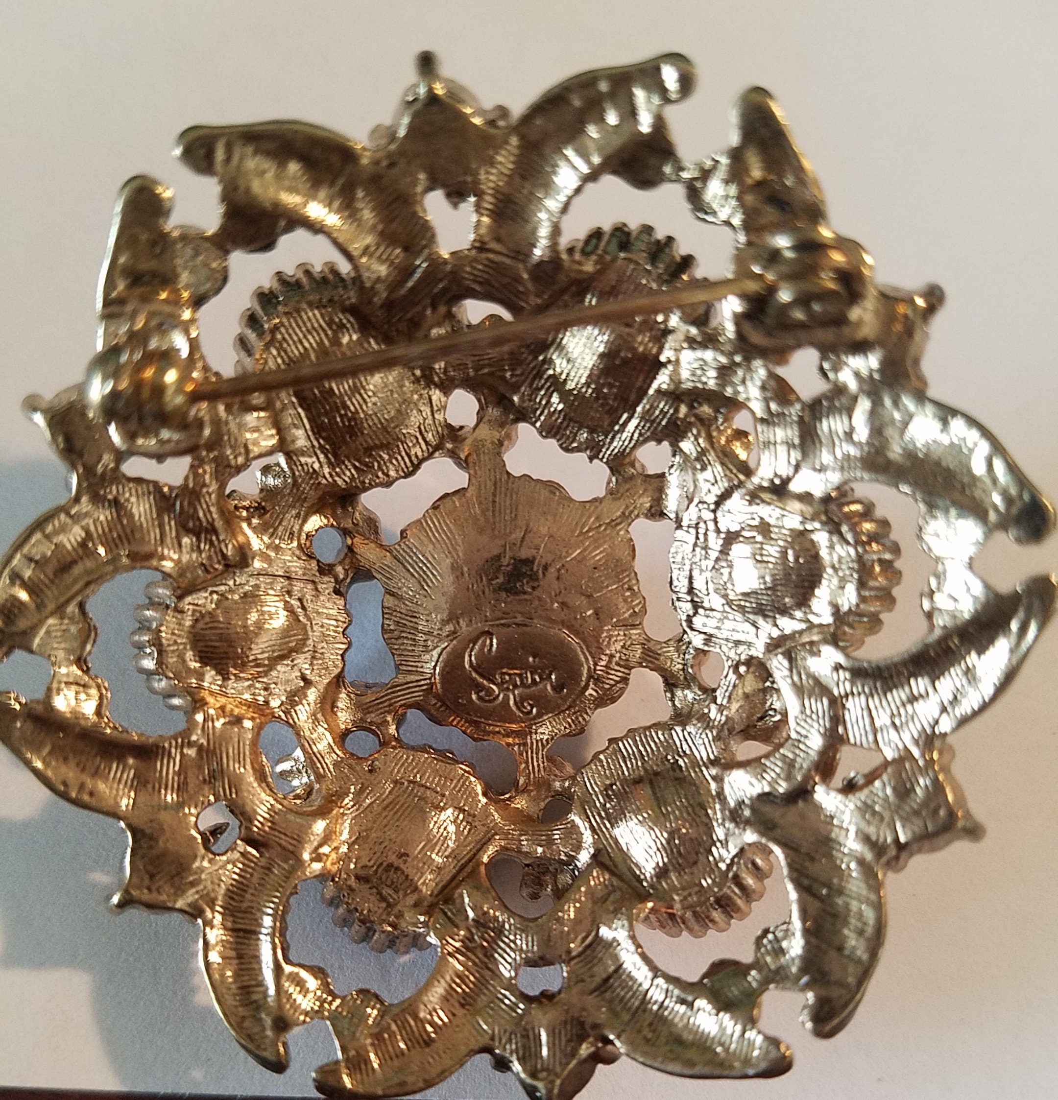 The gold tone jewelry is in wonderful condition and will come in a gift box. The jeweled brooch measures 2 inches in width and .75 inches high. It is signed brooch with the word "Sagin". This jeweled pin would make a great Christmas or Valentine's Day gift for Mom or girlfriend.