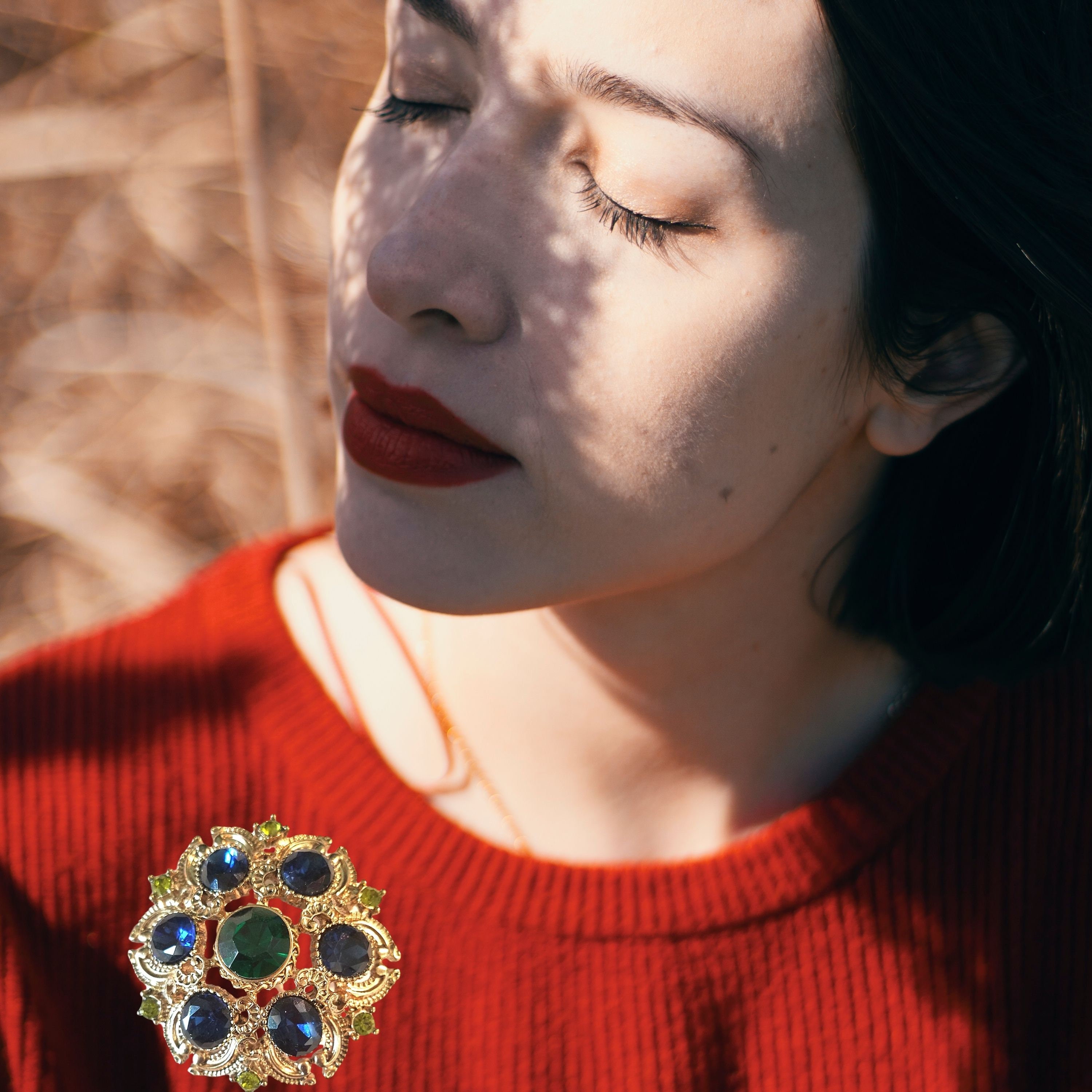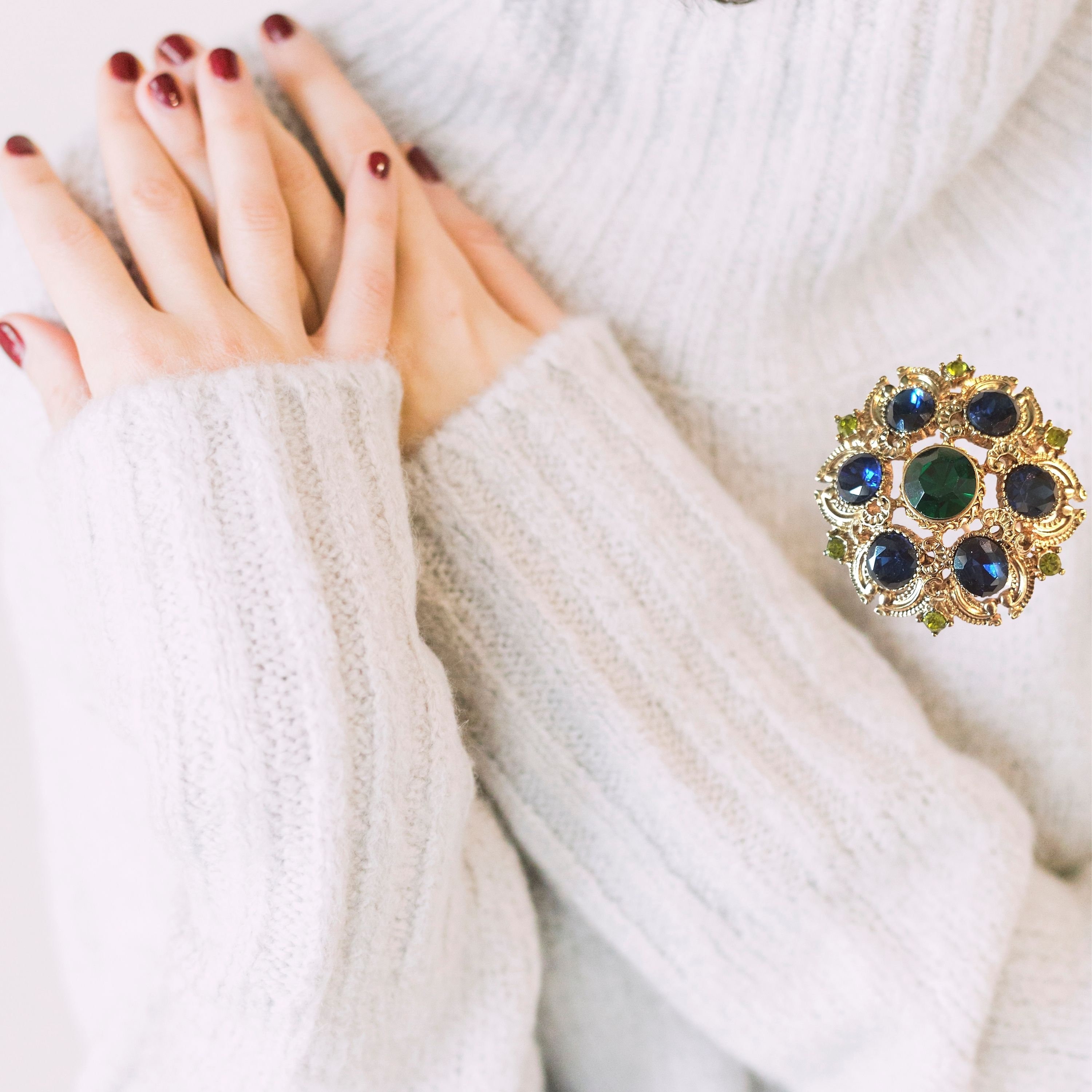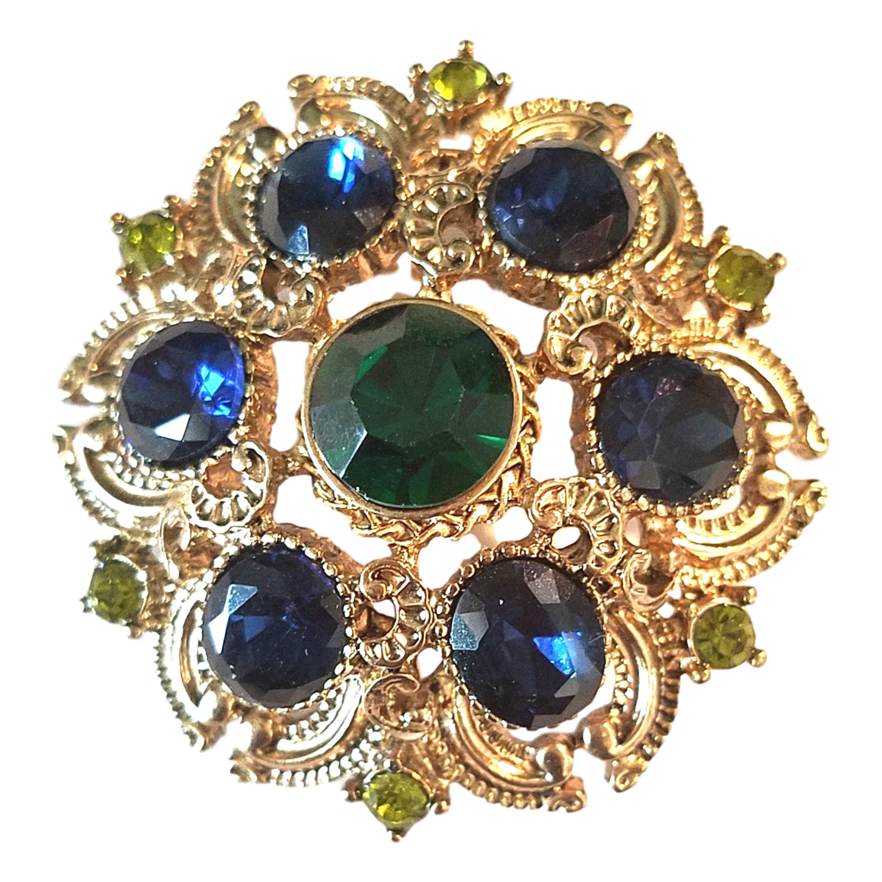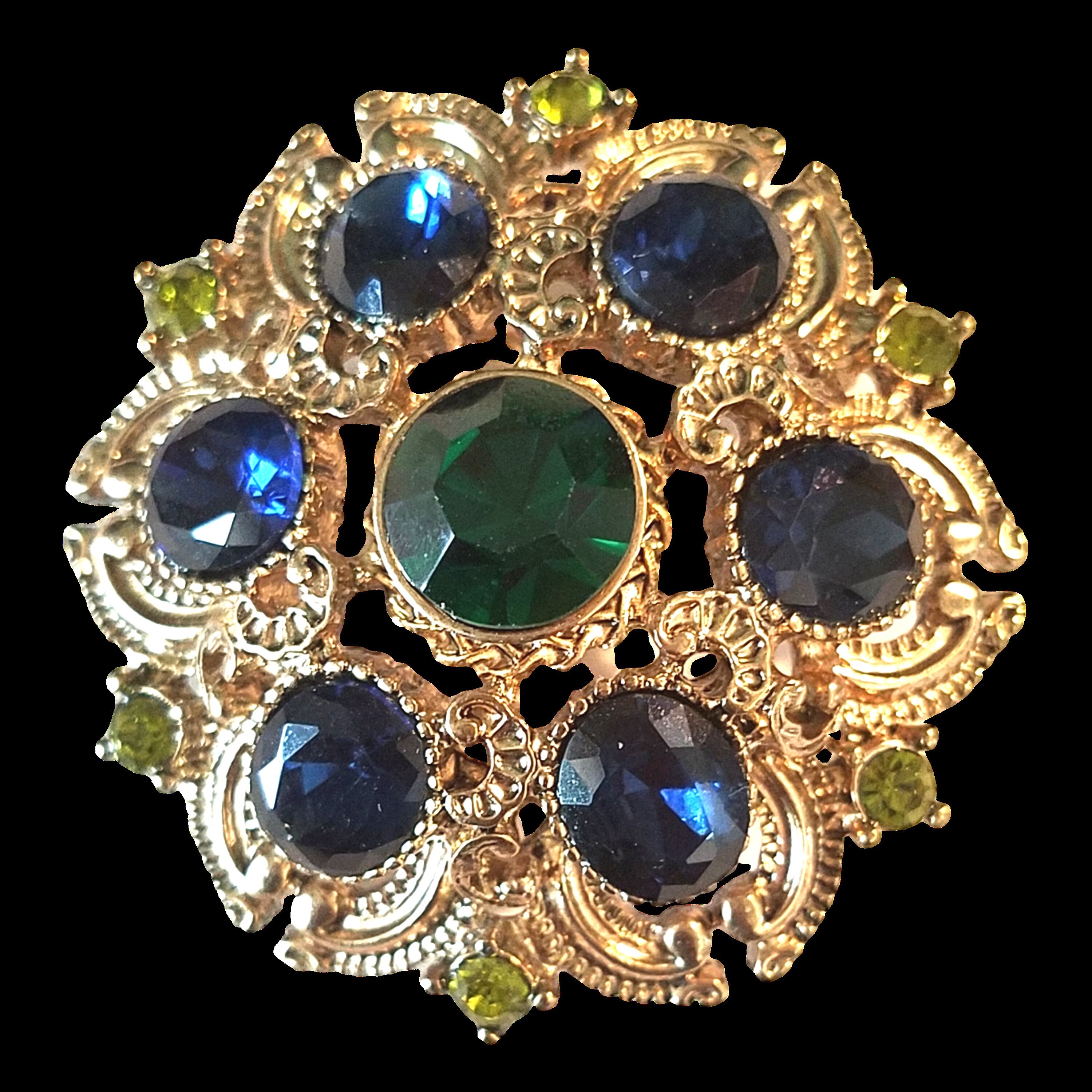 Vintage Sagin Rhinestone Brooch: Faux Sapphire, Emerald & Peridot - Gold Tone