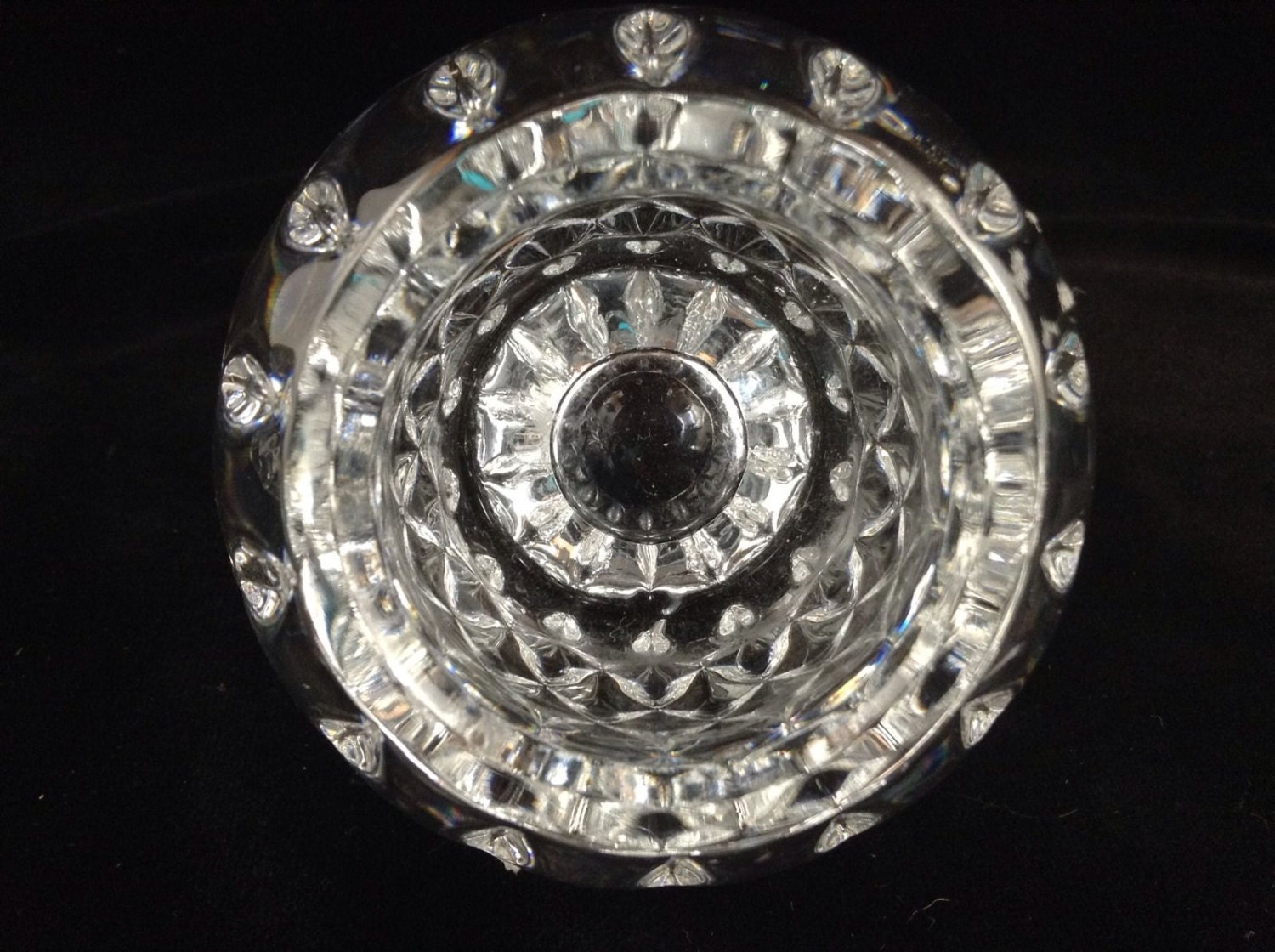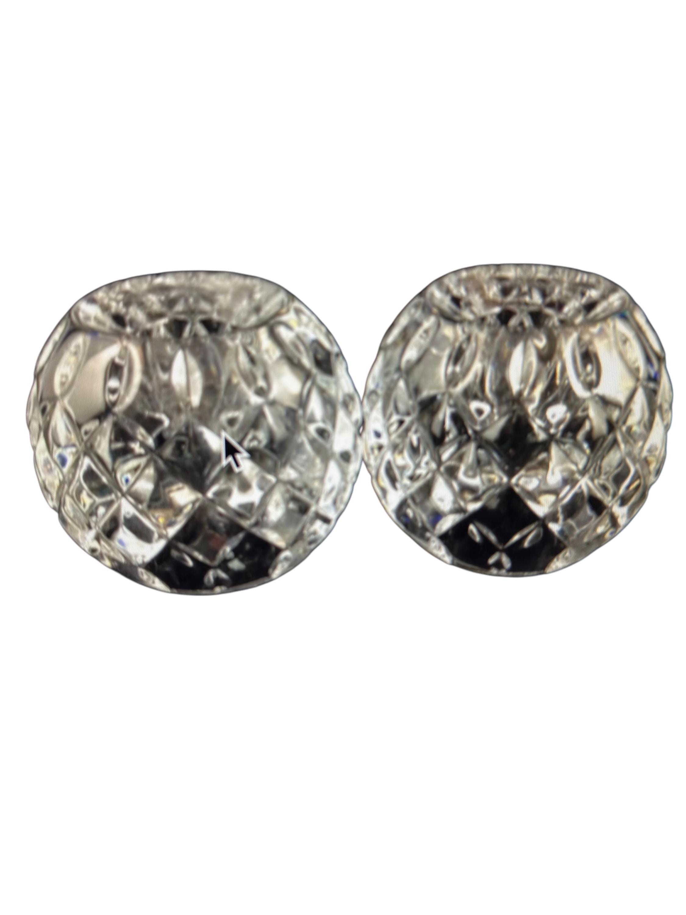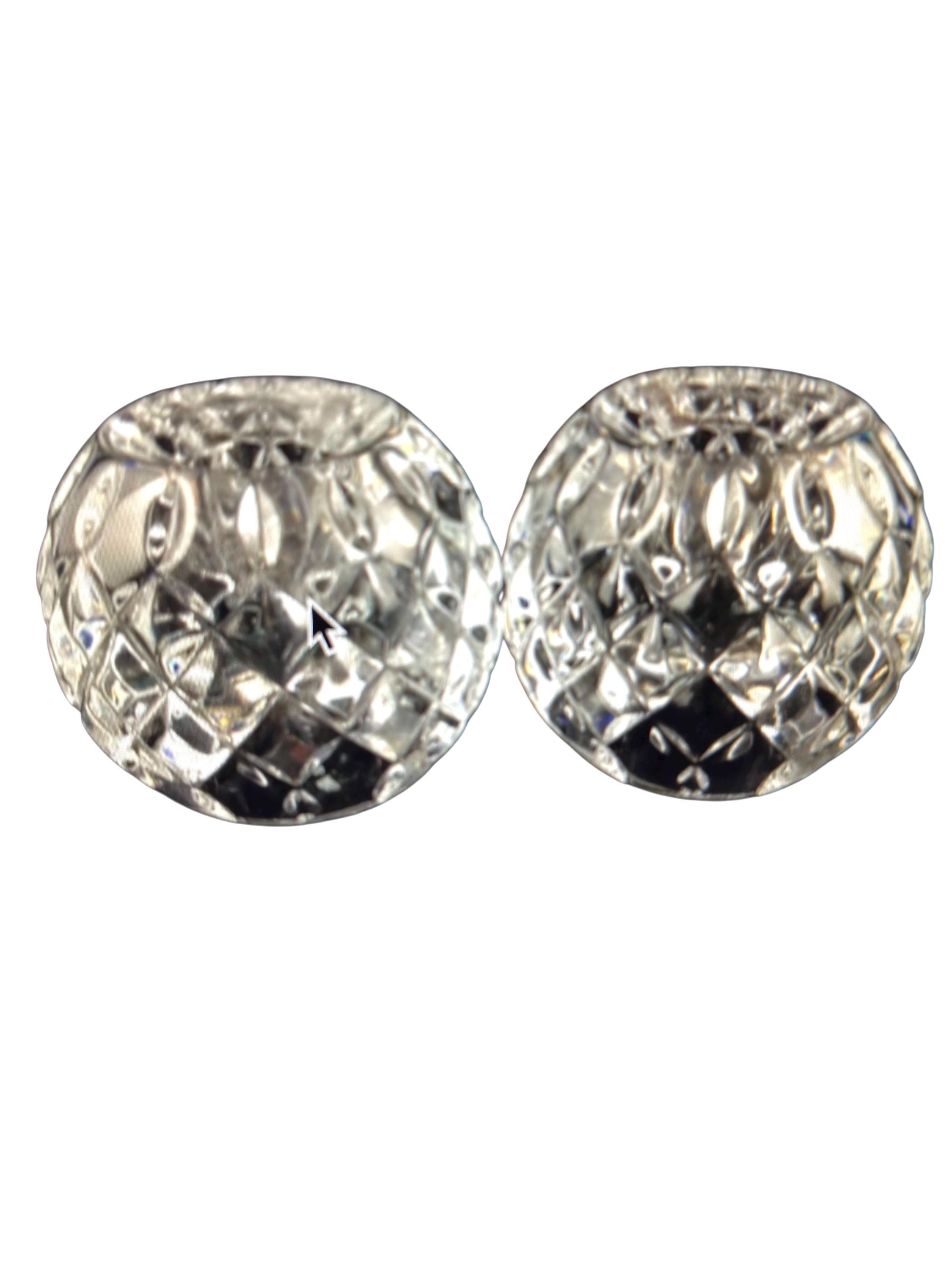 This is an elegant vintage lead crystal glass candle holder set with diamond shaped-pattern and a round orb shape. Dimensions: 9.75" circumference, 2.5" tall, 2" diameter opening on one side, 1" diameter opening on other side.