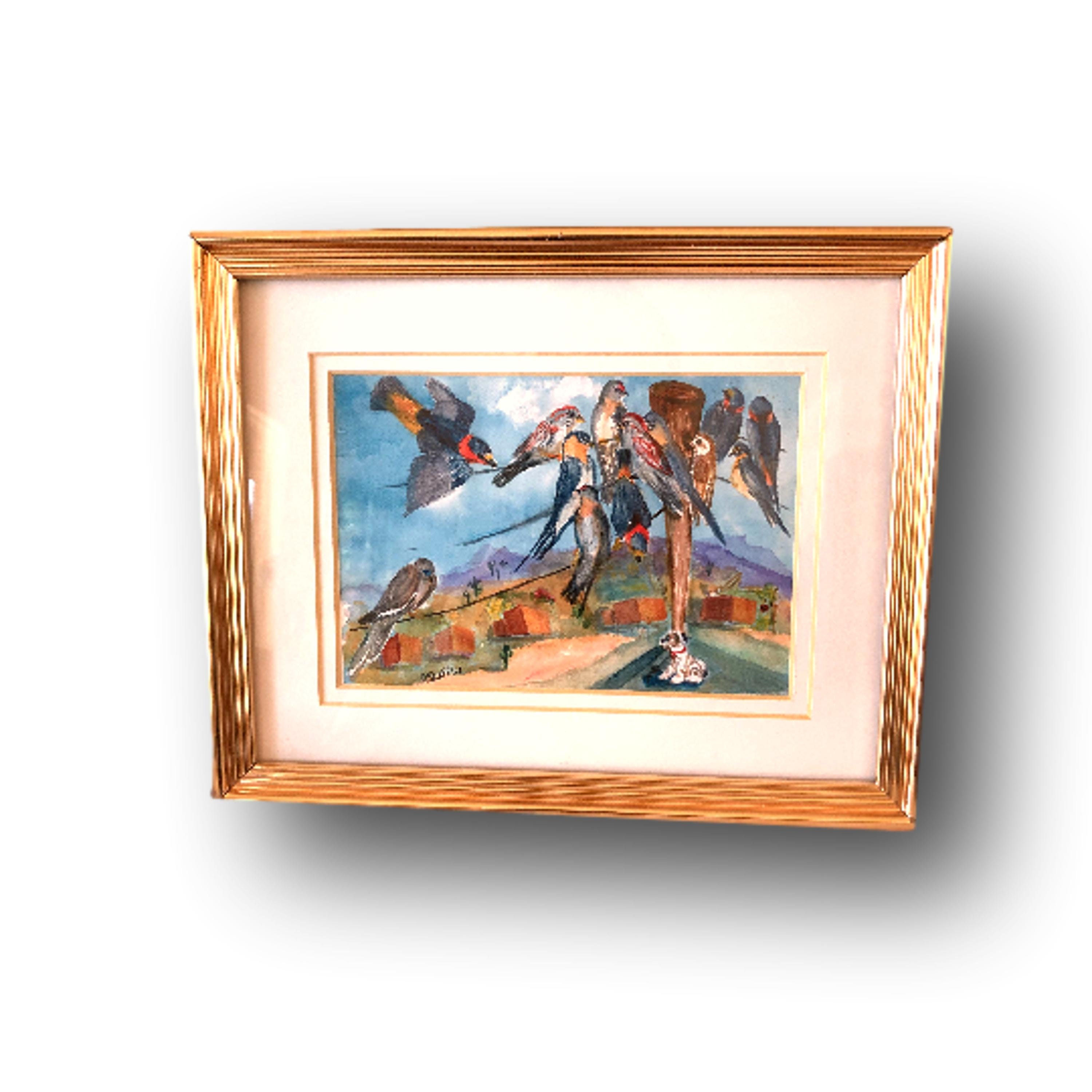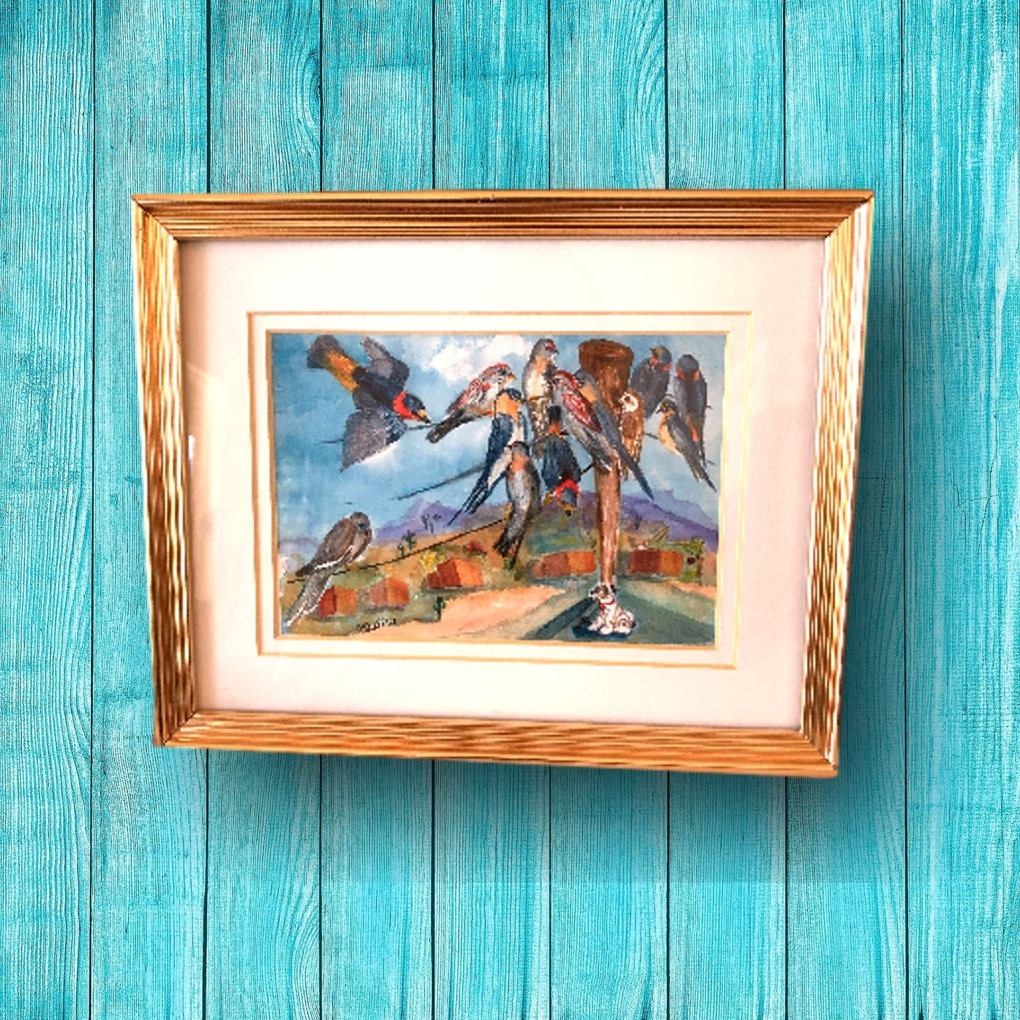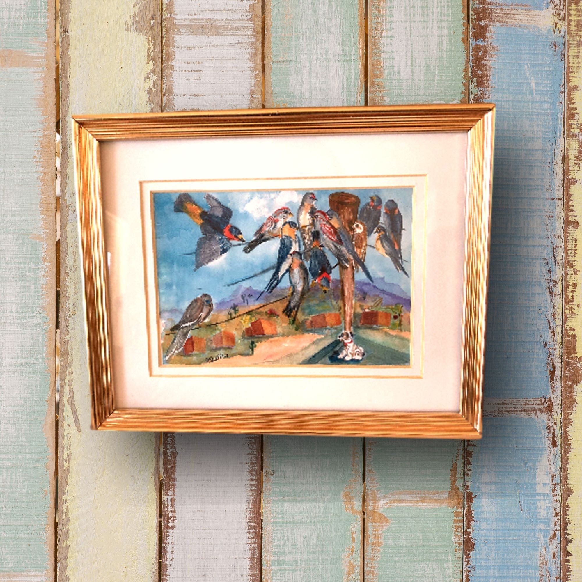 This is an original bird wall art watercolor painting of a flock of colorful birds sitting on a telephone wire. The watercolor art shows mountains in the background with saguaro cactus and a cute puppy sitting below the telephone pole. This picture would look wonderful as RV decor. It is ready to hang. The picture is matted and framed. It measures 10" x 8" and has a gold frame with glass.
