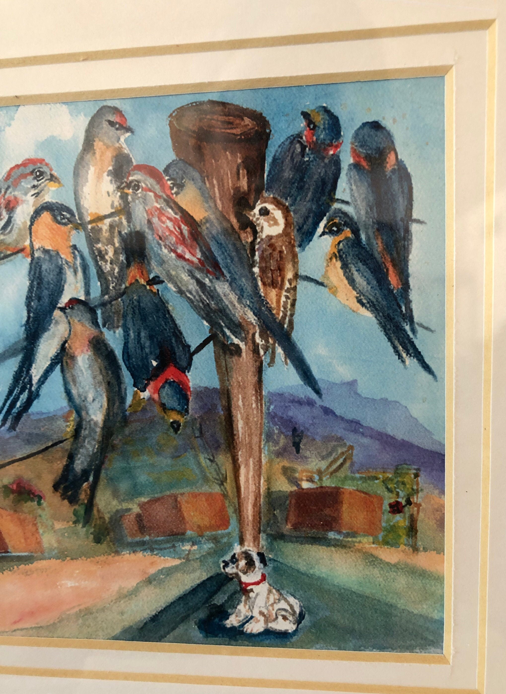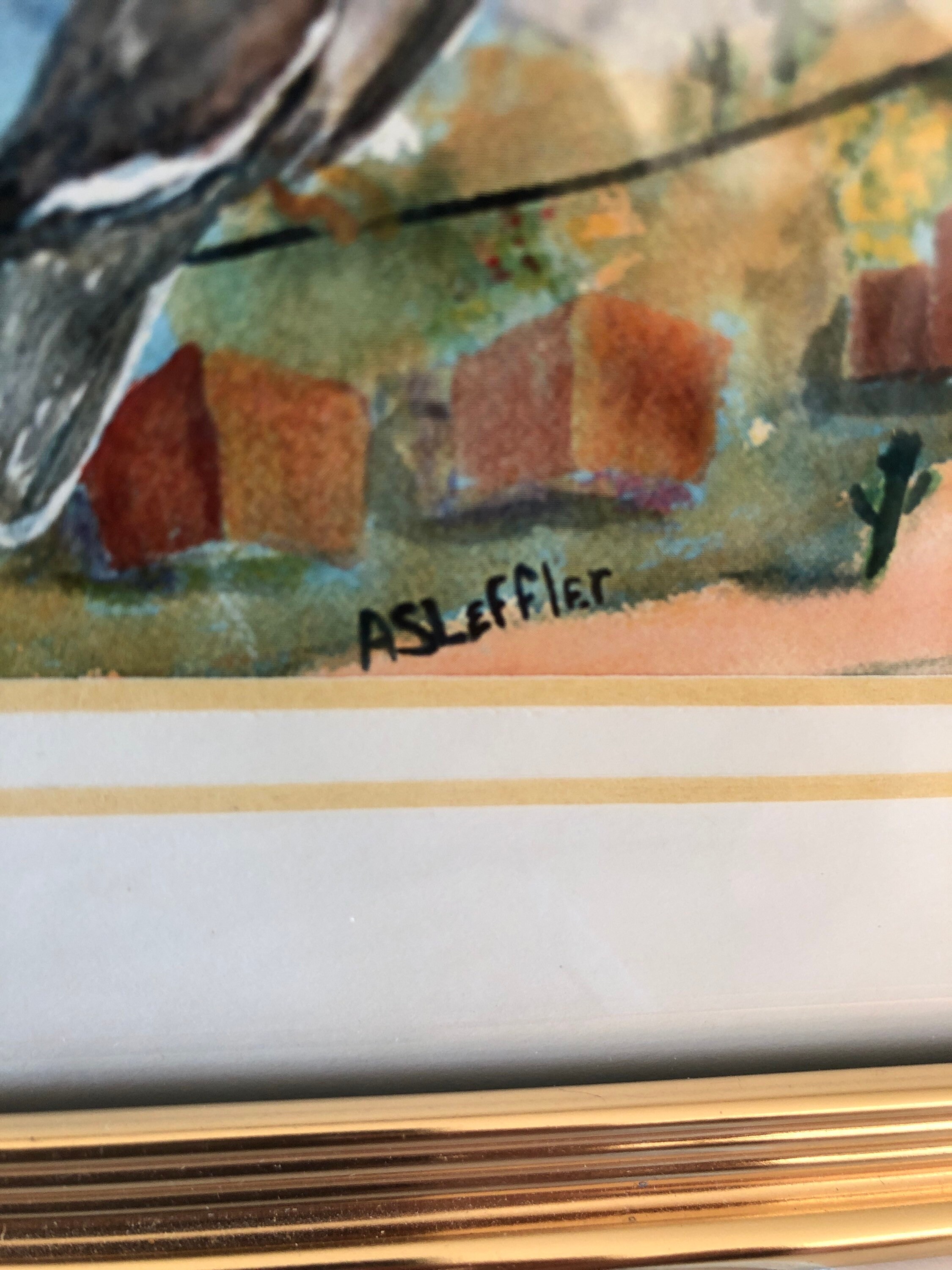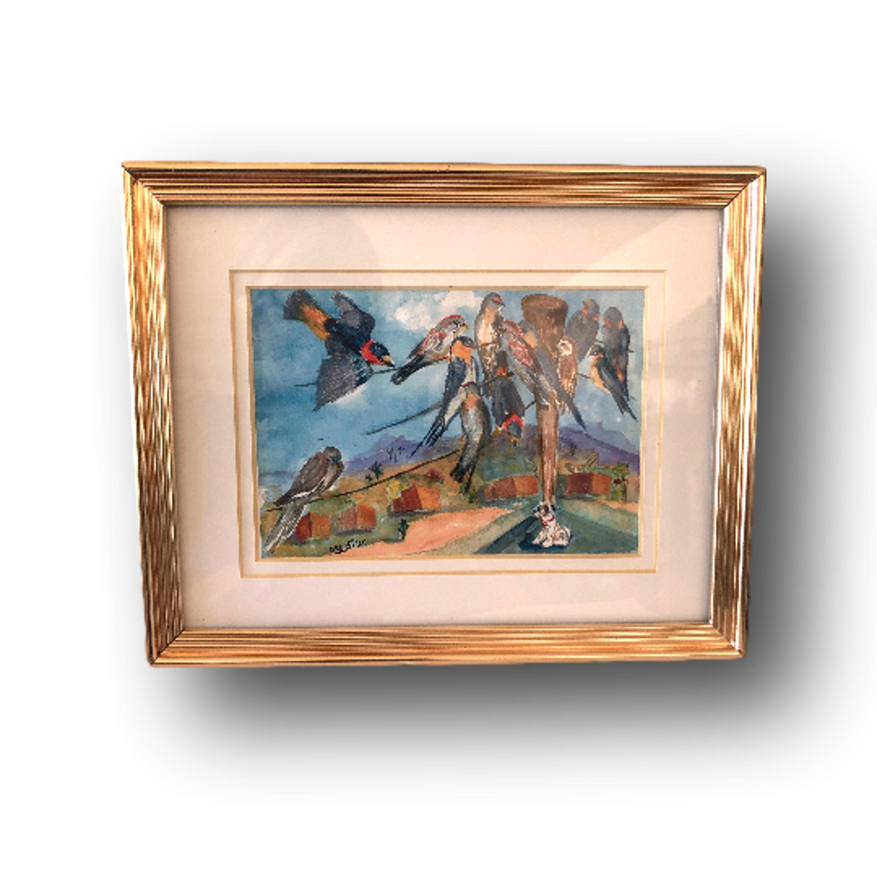 This is an original bird wall art watercolor painting of a flock of colorful birds sitting on a telephone wire. The watercolor art shows mountains in the background with saguaro cactus and a cute puppy sitting below the telephone pole. This picture would look wonderful as RV decor. It is ready to hang. The picture is matted and framed. It measures 10" x 8" and has a gold frame with glass.