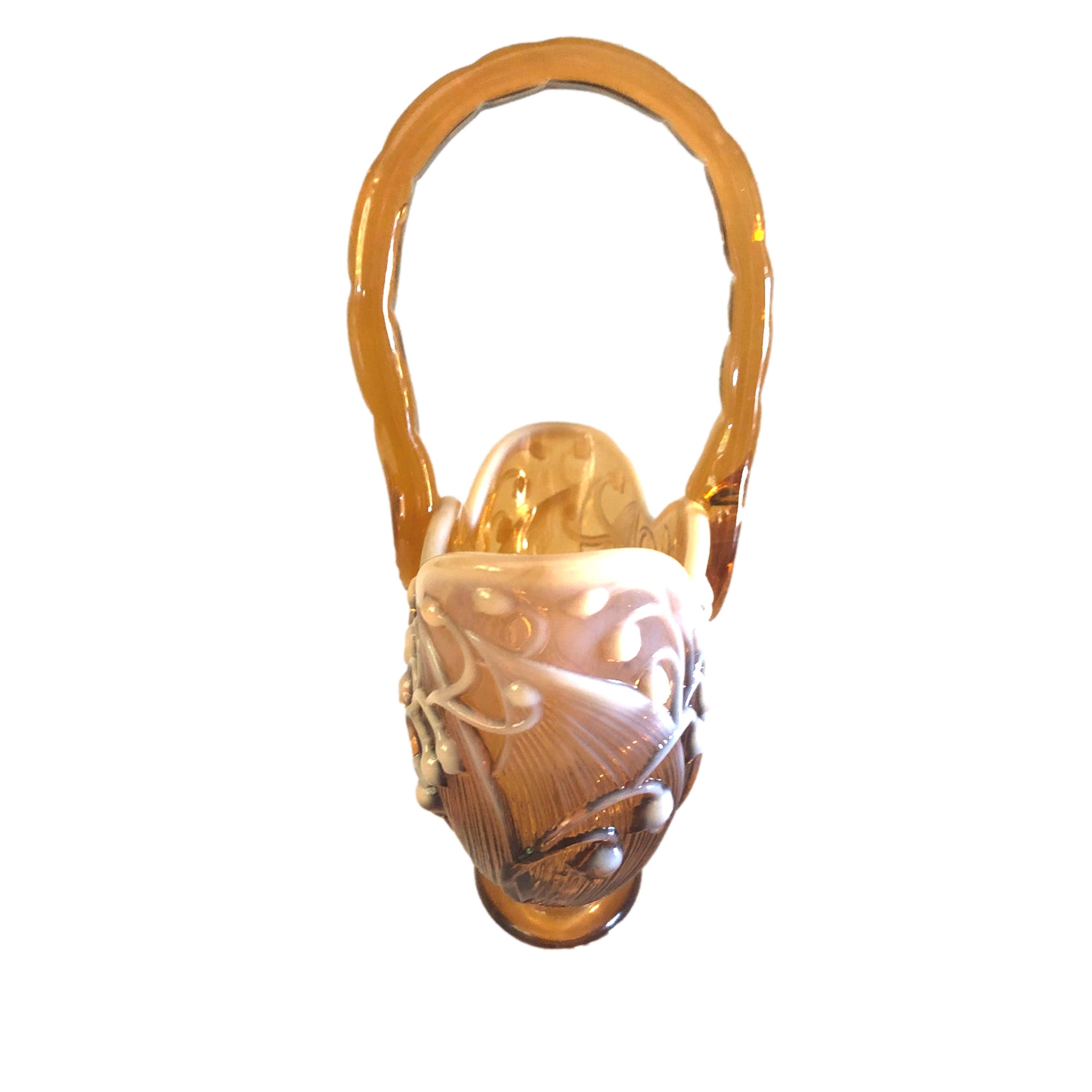 This stunning Fenton (cameo) amber lily of the valley art glass hand blown basket. It goes great in any home. The Fenton glass is simple and affordable way to update your home decor and the glass basket looks awesome. Get yours today!