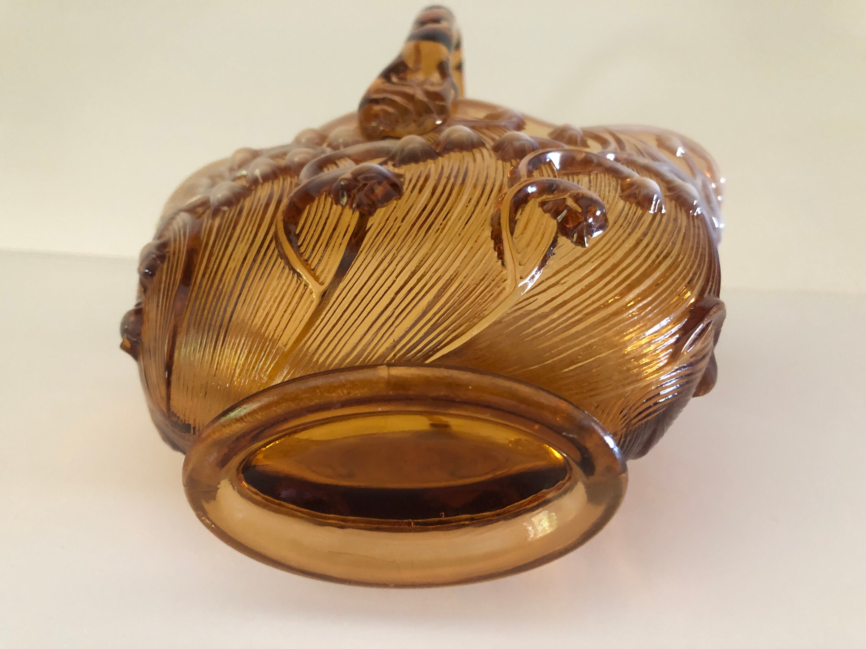 This is a vintage Fenton glass basket in excellent condition. The pattern has white Lily of the Valley flowers. It is opalescent, amber glass. There is the Fenton logo stamped on the bottom of this beautiful carnival glass basket. This Fenton oval basket measures 8" high. Easy to clean. Hand wash in warm soapy water and towel dry.